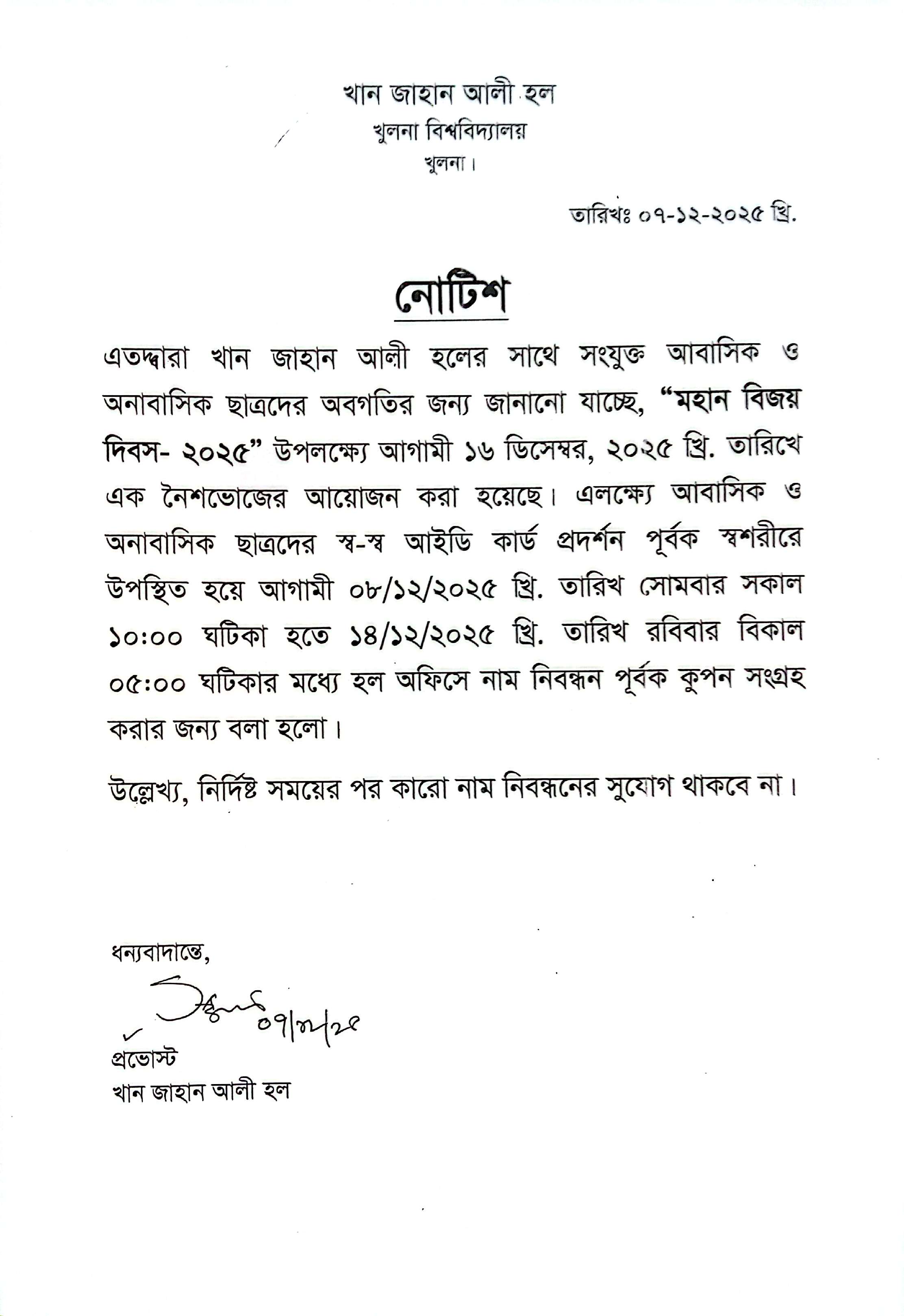 বীরশ্রেষ্ঠ মোহাম্মদ রুহুল আমিন হলে “খুলনা বিশ্ববিদ্যালয় দিবস - ২০২৫” উপলক্ষে বার্ষিক প্রীতিভোজ বিষয়ক নোটিশ