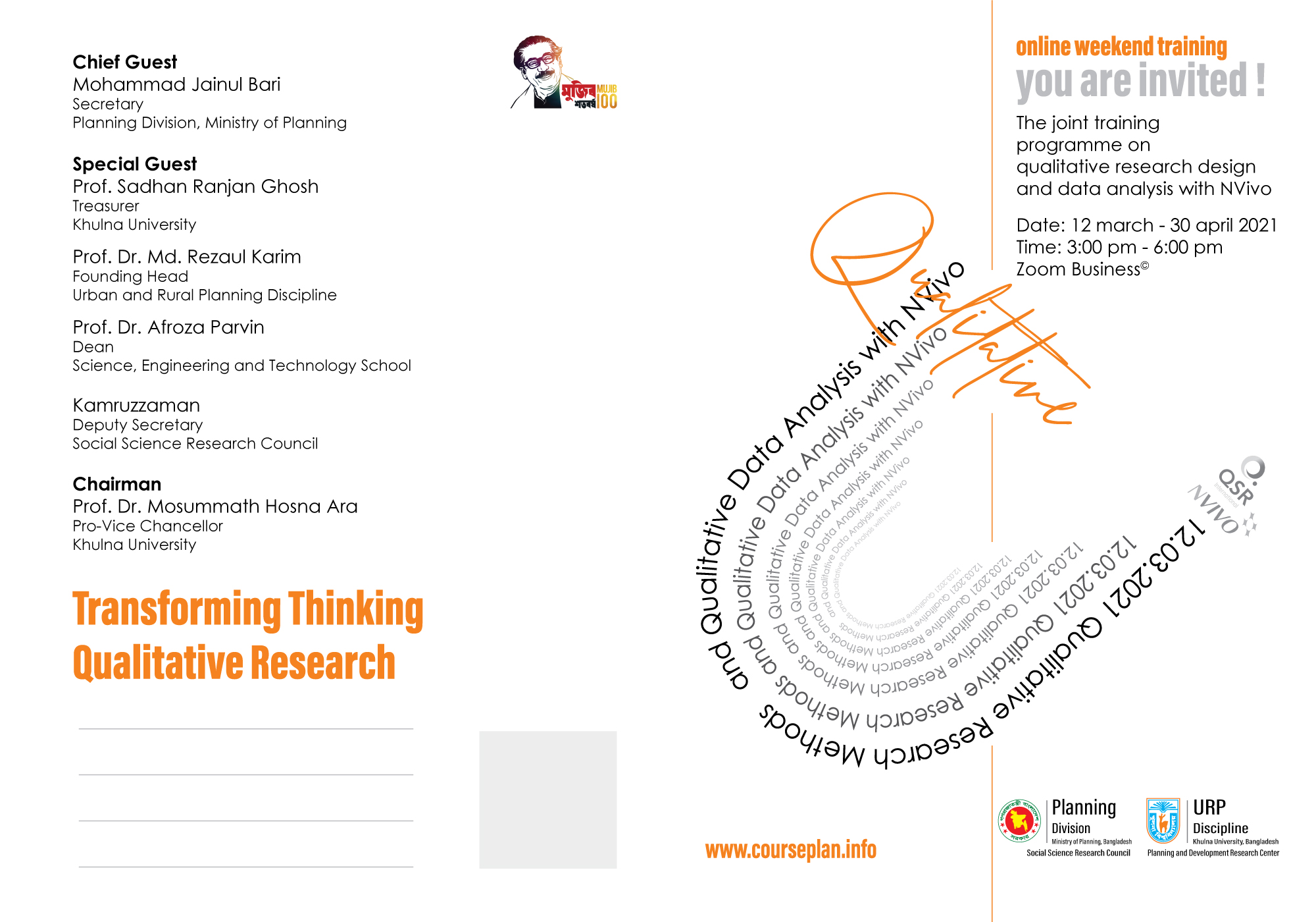 Training Programme on Qualitative Research Design and Data Analysis with Nvivo will happen in Urban and Rural Planning Discipline from 12 March 2021. This is a joint venture between Urban and and Rural Planning Discipline of Khulna University and Social Science Research Council of Planning Commission. More than 90 researchers will particpate in this 8 weeks long training programme. Our faculties Professor Dr. Md. Zakir Hossain, Md. Mostafizur Rahman and Mahmud-Uz-Zaman will be the resource personnel of this training programme. This is the third time this event has been offered by the joint venture between Urban and and Rural Planning Discipline of Khulna University and Social Science Research Council of Planning Commission.