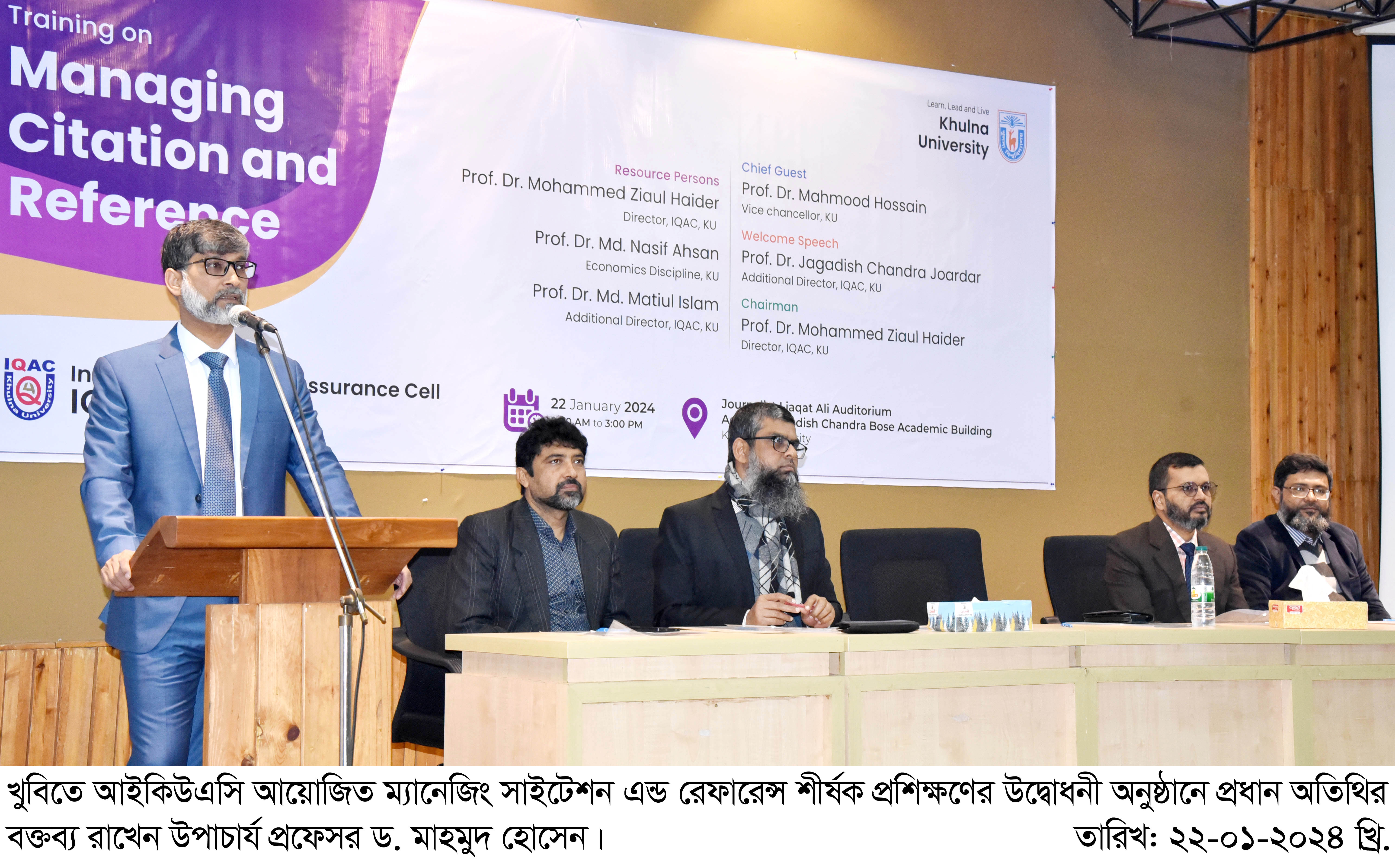 খুলনা বিশ্ববিদ্যালয়ের ইনস্টিটিউশনাল কোয়ালিটি অ্যাসুরেন্স সেল (আইকিউএসি) এর উদ্যোগে ‘ম্যানেজিং সাইটেশন এন্ড রেফারেন্স’ শীর্ষক এক প্রশিক্ষণ আজ ২২ জানুয়ারি (সোমবার) আচার্য জগদীশ চন্দ্র বসু একাডেমিক ভবনের সাংবাদিক লিয়াকত আলী মিলনায়তনে অনুষ্ঠিত হয়। সকাল ৯.১৫ মিনিটে এ প্রশিক্ষণের উদ্বোধনী অনুষ্ঠানে প্রধান অতিথির বক্তব্য রাখেন উপাচার্য প্রফেসর ড. মাহমুদ হোসেন।