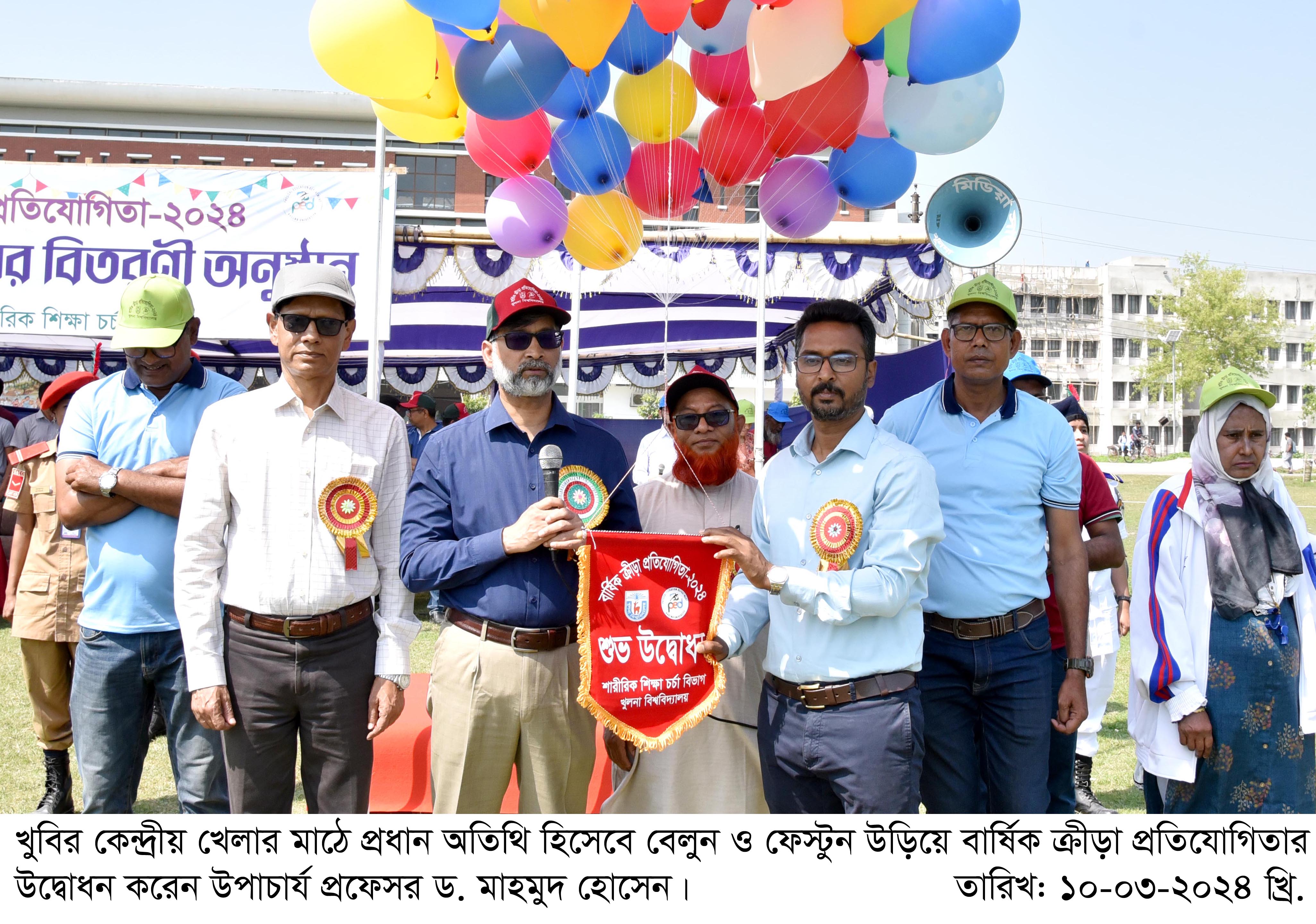 এর আগে সকাল ১০টায় প্রধান অতিথি হিসেবে বেলুন, ফেস্টুন ও পায়রা উড়িয়ে এ প্রতিযোগিতার উদ্বোধন করেন উপাচার্য প্রফেসর ড. মাহমুদ হোসেন। এ সময় তিনি বলেন, নিয়মিত শরীর চর্চা ও খেলাধুলায় অংশগ্রহণের মাধ্যমে শিক্ষার্থীদের সুস্থ মন ও শরীর গঠন হয়। বিশ্ববিদ্যালয়ের মতো উচ্চশিক্ষা প্রতিষ্ঠানে জ্ঞানার্জনের পাশাপাশি খেলাধুলা, বিতর্ক, সাংস্কৃতিক অনুষ্ঠান ও বিভিন্ন সহ-শিক্ষা কার্যক্রমে শিক্ষার্থীরা মুখরিত থাকবে এটাই উচ্চশিক্ষার লক্ষ্য। আর এই লক্ষ্যেই খুলনা বিশ্ববিদ্যালয় প্রতি বছর বার্ষিক ক্রীড়া প্রতিযোগিতাসহ নানা ধরনের ক্রীড়া ইভেন্ট আয়োজন করছে। তিনি বার্ষিক ক্রীড়া প্রতিযোগিতায় অংশগ্রহণকারী শিক্ষার্থীেেদর এবং আয়োজক শারীরিক শিক্ষা চর্চা বিভাগের সংশ্লিষ্টদের আন্তরিকভাবে ধন্যবাদ জানান। একই সাথে আগামীতেও এ প্রতিযোগিতা আয়োজন করা হবে বলে আশাবাদ ব্যক্ত করেন।