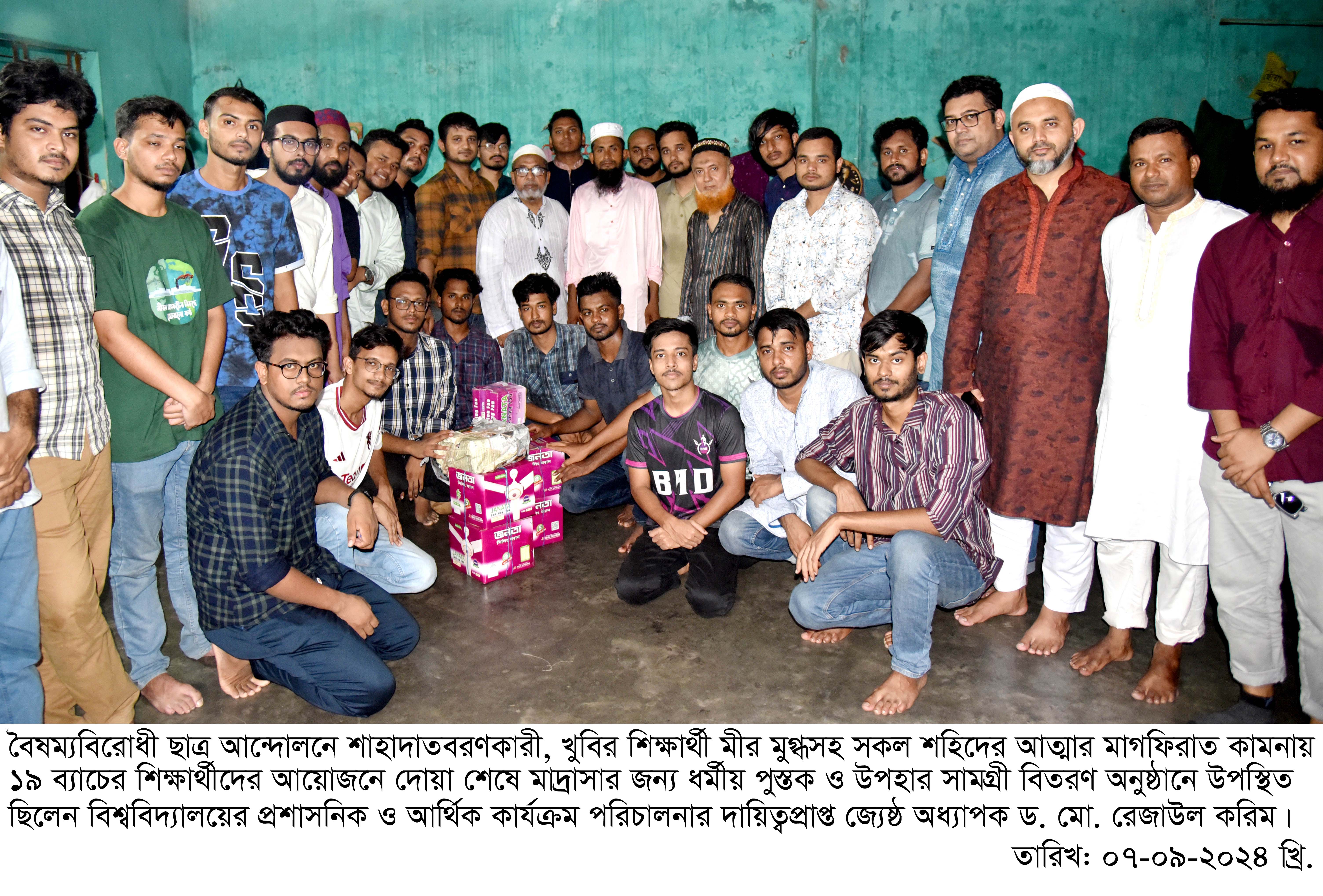 বৈষম্যবিরোধী ছাত্র আন্দোলনে শাহাদাতবরণকারী, খুলনা বিশ্ববিদ্যালয়ের গণিত ডিসিপ্লিনের ’১৯ ব্যাচের শিক্ষার্থী মীর মাহফুজুর রহমান মুগ্ধসহ সকল শহিদের আত্মার মাগফিরাত কামনায় আজ ০৭ সেপ্টেম্বর (শনিবার) বাদ জোহর জিরোপয়েন্ট সংলগ্ন খানবাহাদুর আহসানউল্লাহ নূরানী হাফিজিয়া মাদ্রাসা এতিমখানা ও লিল্লাহ বোর্ডিংয়ে দিনব্যাপী কোরআন খানী ও দোয়া মাহফিল অনুষ্ঠিত হয়। খুলনা বিশ্ববিদ্যালয়ের ’১৯ ব্যাচের শিক্ষার্থীদের আয়োজিত এই দোয়া অনুষ্ঠান থেকে মাদ্রাসার জন্য ধর্মীয় পুস্তক ও সিলিং ফ্যান প্রদান করা হয়। এ ছাড়া ৪০ জন এতিম হাফেজ শিক্ষার্থীর দুই বেলা খাবারের ব্যবস্থা করা হয়।