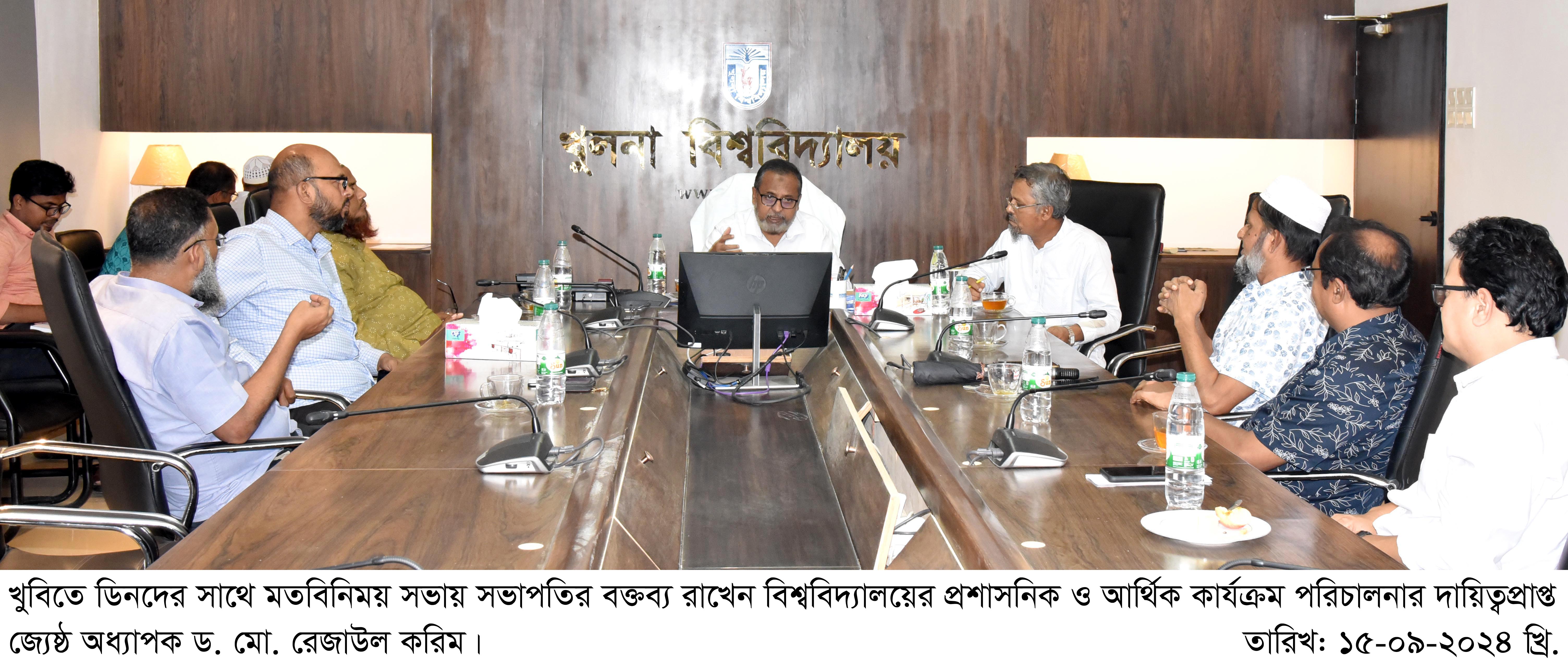 খুলনা বিশ্ববিদ্যালয়ের প্রশাসনিক ও আর্থিক কার্যক্রম পরিচালনার দায়িত্বপ্রাপ্ত জ্যেষ্ঠ অধ্যাপক ড. মো. রেজাউল করিম এর সভাপতিত্বে বিশ্ববিদ্যালয়ের ডিনবৃন্দের সমন্বয়ে এক মতবিনিময় সভা আজ ১৫ সেপ্টেম্বর (রবিবার) দুপুর ২.৩০ মিনিটে শহিদ তাজউদ্দীন আহমদ প্রশাসনিক ভবনের ২য় তলাস্থ সম্মেলন কক্ষে অনুষ্ঠিত হয়।