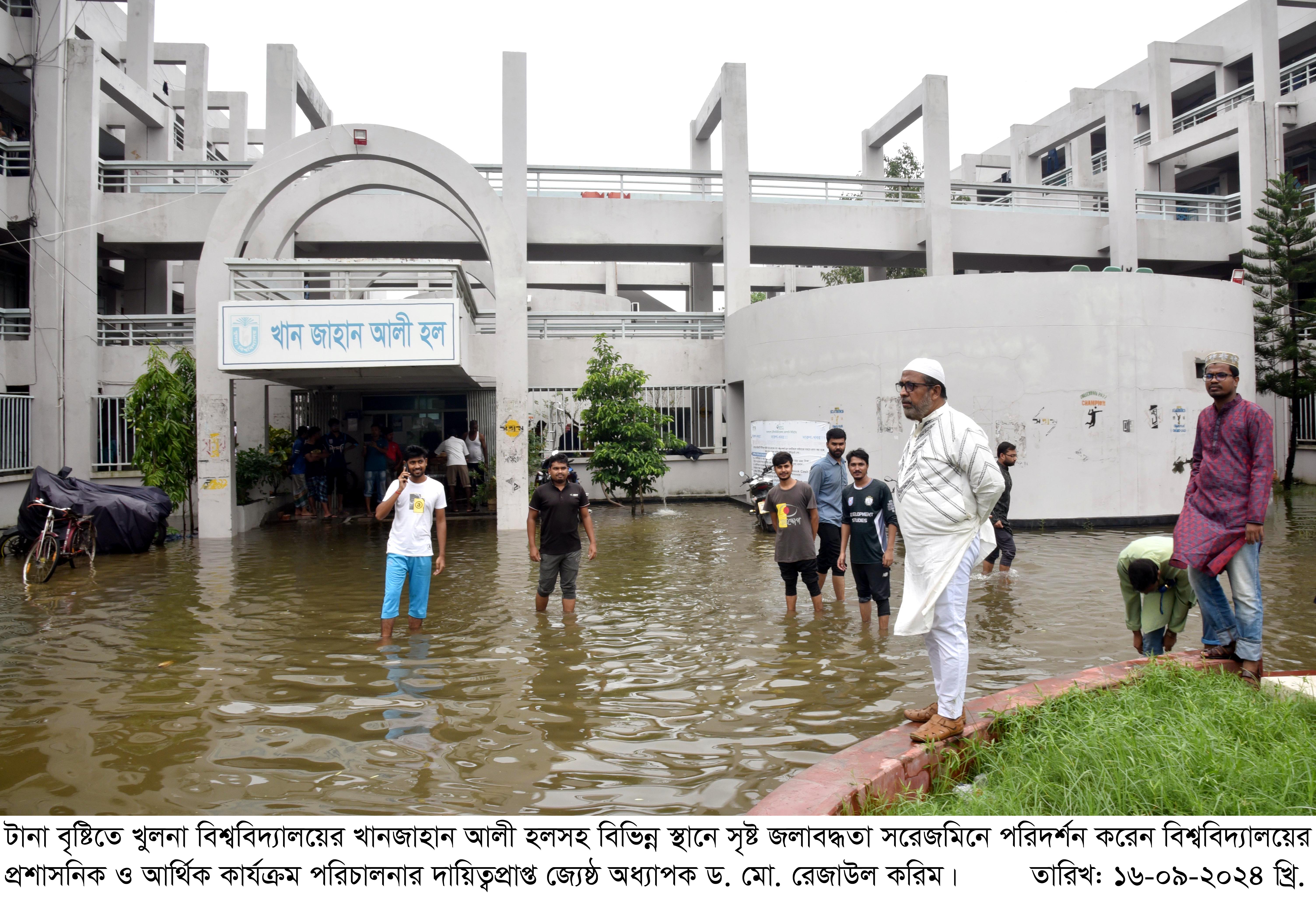 টানা বৃষ্টিতে খুলনা বিশ্ববিদ্যালয়ের খানজাহান আলী হলসহ বিভিন্ন স্থানে জলাবদ্ধতা সৃষ্টি হওয়ায় দ্রুত পানি নিষ্কাশনের জন্য ব্যবস্থা গ্রহণের নির্দেশ দিয়েছেন বিশ্ববিদ্যালয়ের প্রশাসনিক ও আর্থিক কার্যক্রম পরিচালনার দায়িত্বপ্রাপ্ত জ্যেষ্ঠ অধ্যাপক ড. মো. রেজাউল করিম। আজ ১৬ সেপ্টেম্বর (সোমবার) দুপুর ১টার দিকে খানজাহান আলী হল পরিদর্শন করেন। এ সময় তিনি হলের বিভিন্ন কক্ষে যান এবং শিক্ষার্থীদের সাথে কথা বলেন। শিক্ষার্থীরা বৃষ্টিতে সৃষ্ট তাদের নানা সমস্যা ও দুর্ভোগের কথা তুলে ধরেন। এ সময় তিনি হলের দায়িত্বরত কর্মকর্তাদের দ্রুত পানি নিষ্কাশনের জন্য ব্যবস্থা গ্রহণের নির্দেশ দেন।