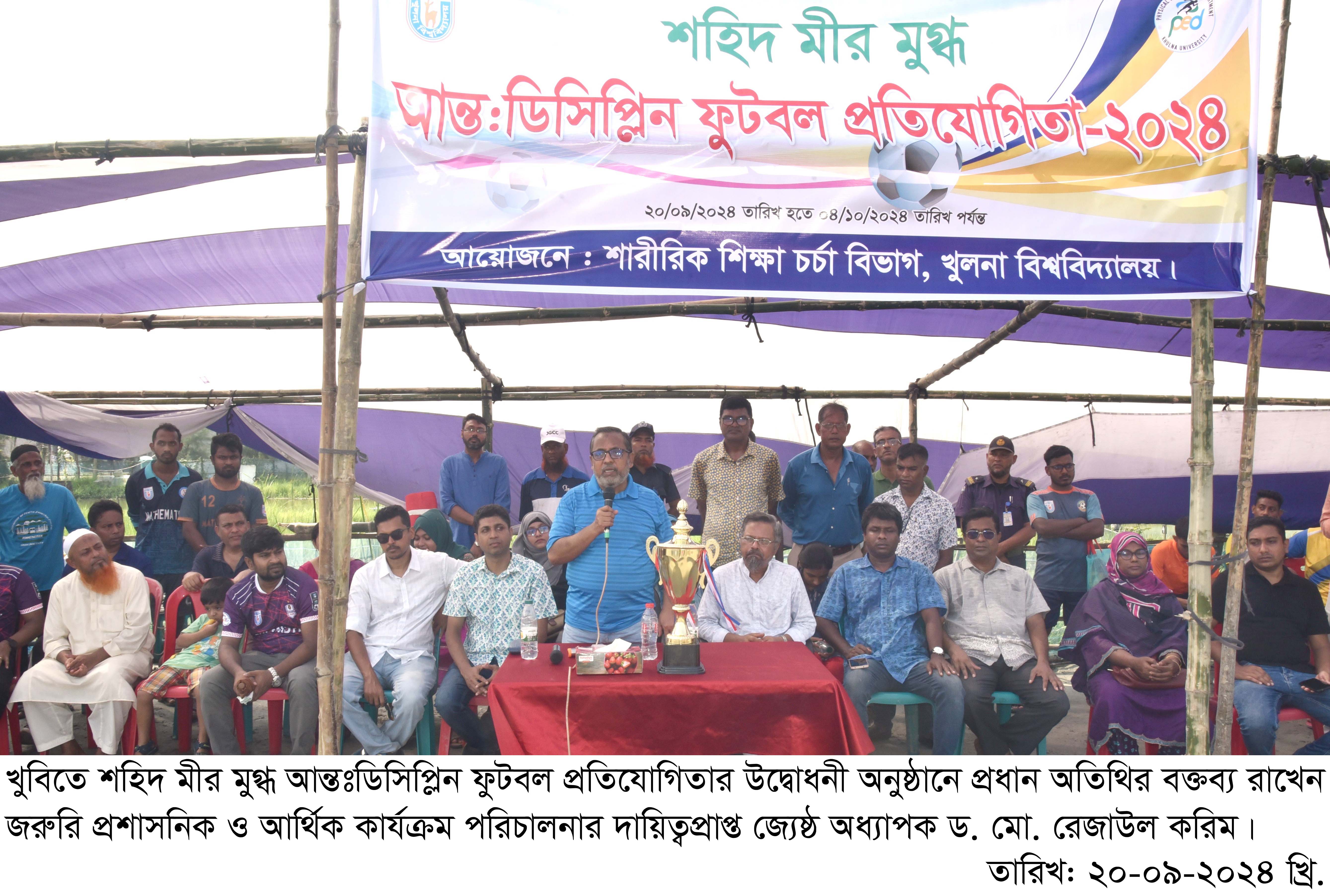 খুলনা বিশ্ববিদ্যালয়ে শুরু হয়েছে শহিদ মীর মুগ্ধ আন্তঃডিসিপ্লিন ফুটবল প্রতিযোগিতা-২০২৪। আজ ২০ সেপ্টেম্বর (শুক্রবার) সকাল ৯টায় শারীরিক শিক্ষা চর্চা বিভাগের আয়োজনে নির্মাণাধীন জয়বাংলা ভবনের সামনের মাঠে এ প্রতিযোগিতার উদ্বোধনী অনুষ্ঠানে প্রধান অতিথির বক্তব্য রাখেন বিশ্ববিদ্যালয়ের জরুরি প্রশাসনিক ও আর্থিক কার্যক্রম পরিচালনার দায়িত্বপ্রাপ্ত জ্যেষ্ঠ অধ্যাপক ড. মো. রেজাউল করিম।