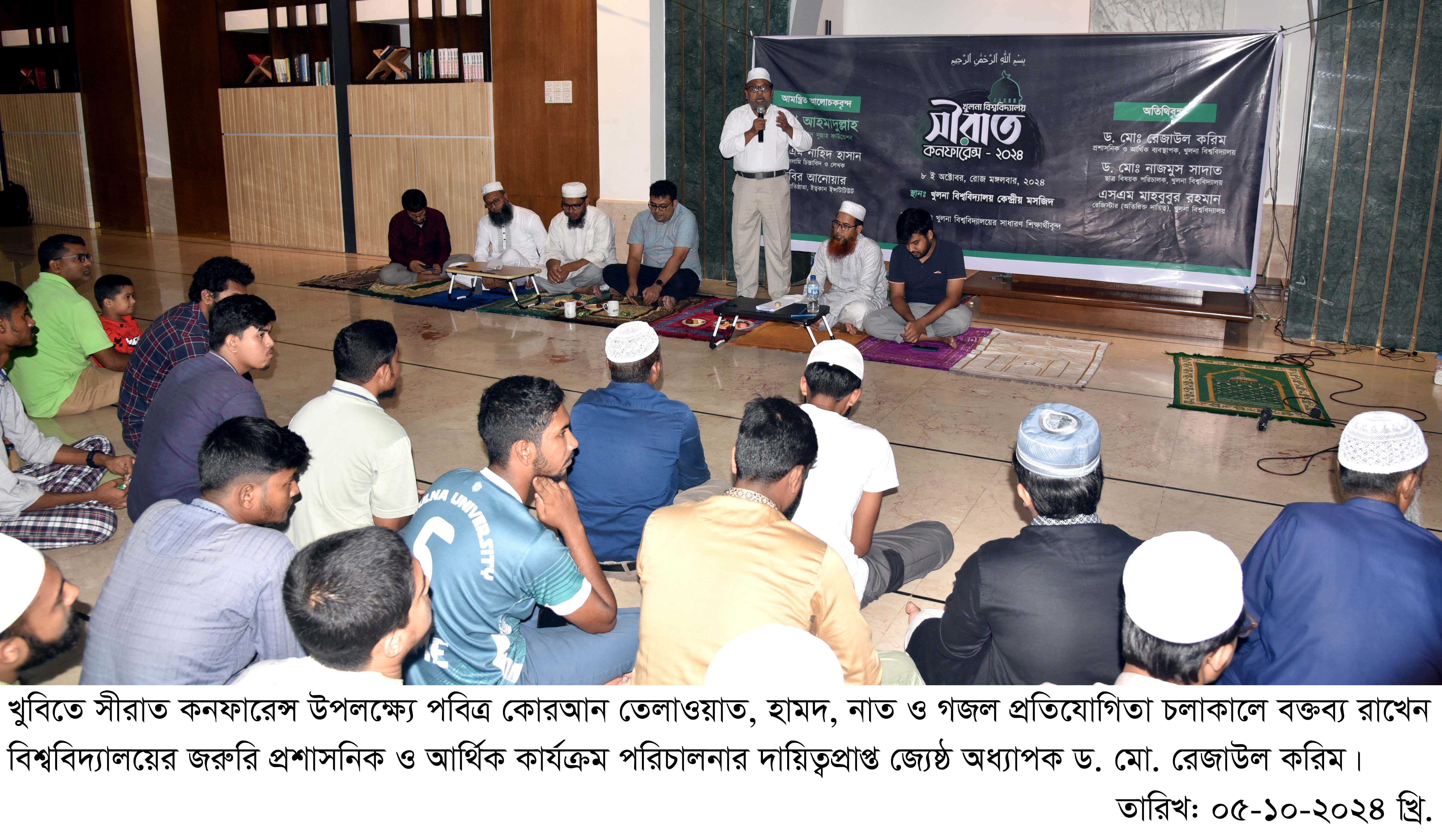 খুলনা বিশ্ববিদ্যালয়ের সীরাত কনফারেন্স-২০২৪ উপলক্ষ্যে পবিত্র কোরআন তেলাওয়াত, হামদ, নাত ও গজল প্রতিযোগিতা অনুষ্ঠিত হয়েছে। আজ ০৫ অক্টোবর (শনিবার) বাদ আসর বিশ্ববিদ্যালয়ের কেন্দ্রীয় জামে মসজিদে এ প্রতিযোগিতা শুরু হয়। বাদ মাগরিব এ প্রতিযোগিতা দেখতে আসেন খুলনা বিশ্ববিদ্যালয়ের জরুরি প্রশাসনিক ও আর্থিক কার্যক্রম পরিচালনার দায়িত্বপ্রাপ্ত জ্যেষ্ঠ অধ্যাপক ড. মো. রেজাউল করিম।