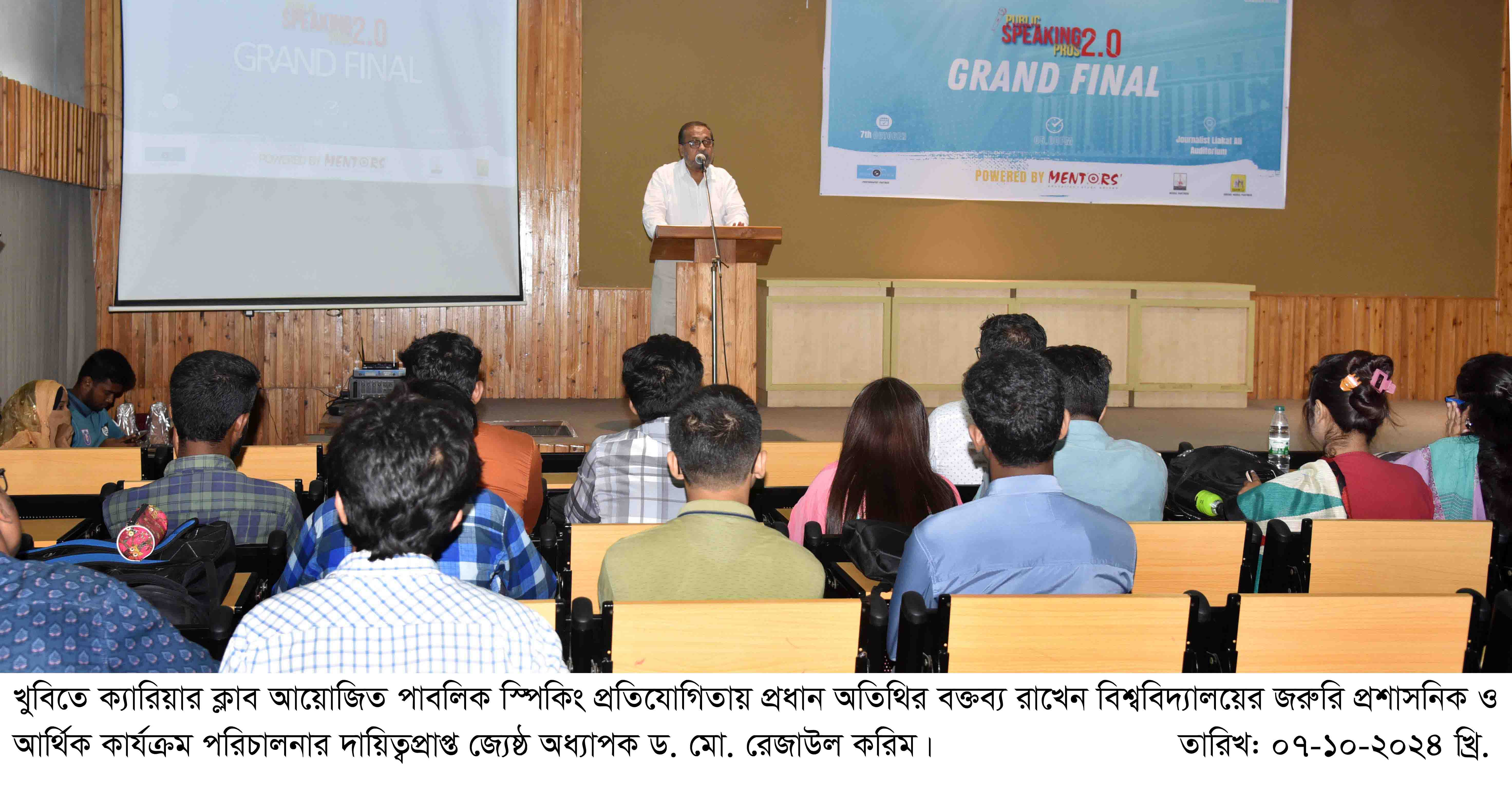 খুলনা বিশ্ববিদ্যালয় ক্যারিয়ার ক্লাবের আয়োজনে এবং মেন্টর্স খুলনার পৃষ্ঠপোষকতায় আজ ০৭ অক্টোবর (সোমবার) বিকাল ৫টায় আচার্য জগদীশচন্দ্র বসু একাডেমিক ভবনের সাংবাদিক লিয়াকত আলী মিলনায়তনে পাবলিক স্পিকিং প্রতিযোগিতা ‘পাবলিক স্পিকিং প্রোজ ২.০’ এর গ্র্যান্ড ফিনালে অনুষ্ঠিত হয়। অনুষ্ঠানে প্রধান অতিথি ছিলেন বিশ্ববিদ্যালয়ের জরুরি প্রশাসনিক ও আর্থিক কার্যক্রম পরিচালনার দায়িত্বপ্রাপ্ত জ্যেষ্ঠ অধ্যাপক ড. মো. রেজাউল করিম।