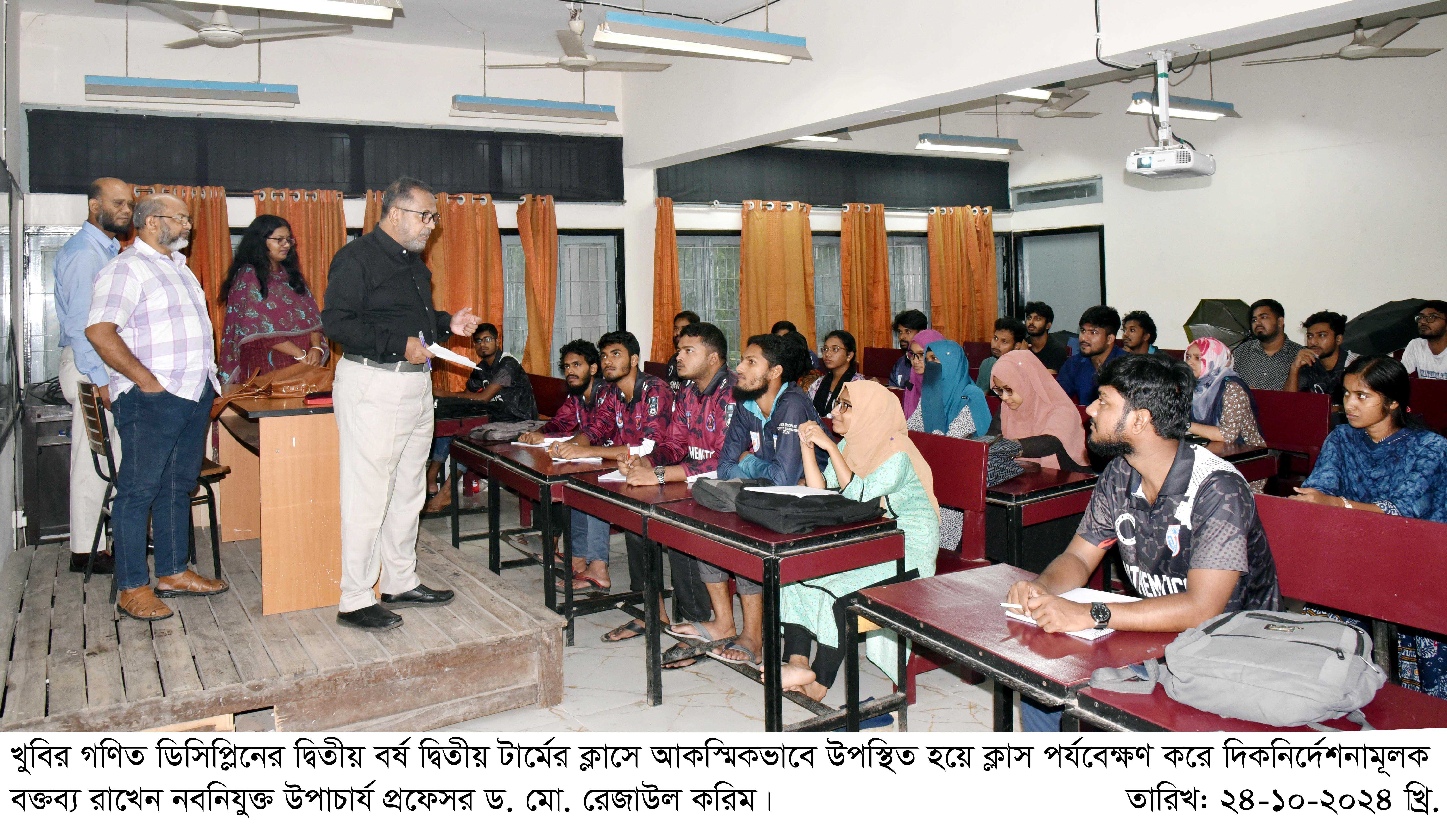আজ ২৪ অক্টোবর (বৃহস্পতিবার) বেলা সাড়ে ১১টার দিকে খুলনা বিশ্ববিদ্যালয়ের গণিত ডিসিপ্লিনের চলমান একটি ক্লাসে আকস্মিকভাবে উপস্থিত হন নবনিযুক্ত উপাচার্য প্রফেসর ড. মো. রেজাউল করিম। তখন গণিত ডিসিপ্লিনের দ্বিতীয় বর্ষ দ্বিতীয় টার্মের ক্লাস চলছিল। ক্লাসে উপস্থিত হয়ে তিনি কিছু সময় শিক্ষার্থীদের সাথে বসে পাঠদানরত শিক্ষকের ক্লাস পর্যবেক্ষণ করেন। পরে তিনি শিক্ষক ও শিক্ষার্থীদের উদ্দেশ্যে কিছু দিকনির্দেশনা প্রদান করেন।