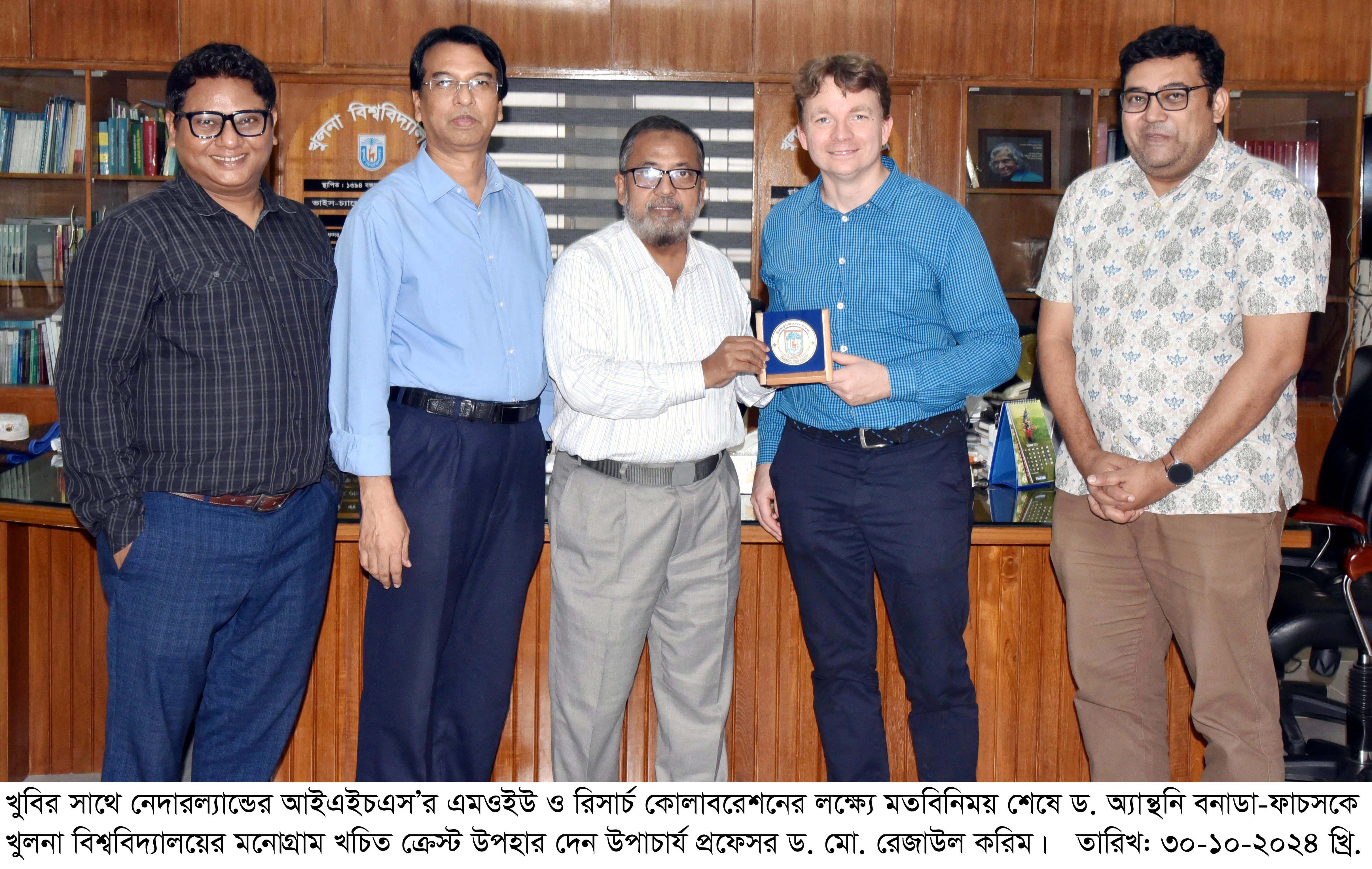 খুলনা বিশ্ববিদ্যালয়ের দি অফিস অব ইন্টারন্যাশনাল অ্যাফেয়ার্সের সাথে নেদারল্যান্ডের ইরাসমাস ইউনিভার্সিটি রটারডামের ইনস্টিউট ফর হাউজিং এন্ড আরবান ডেভেলপমেন্ট স্টাডিজ (আইএইচএস) এর এমওইউ স্বাক্ষর ও কোলাবরেশনের লক্ষ্যে এক মতবিনিময় সভা আজ ৩০ অক্টোবর (বুধবার) দুপুরে অনুষ্ঠিত হয়। সভায় প্রধান অতিথি হিসেবে উপস্থিত ছিলেন খুলনা বিশ্ববিদ্যালয়ের উপাচার্য প্রফেসর ড. মো. রেজাউল করিম।