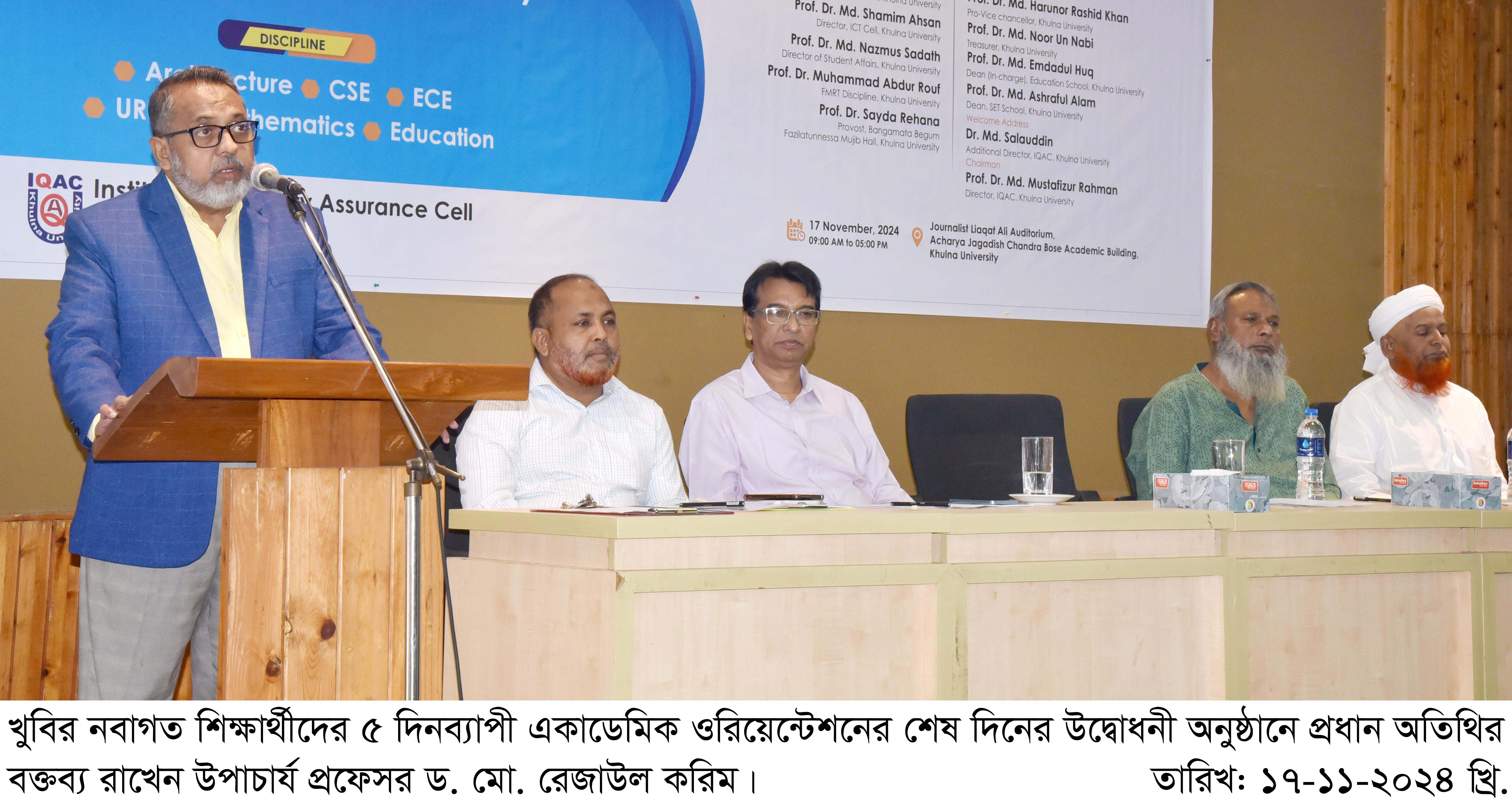 উদ্বোধনী অনুষ্ঠানে বিশেষ অতিথির বক্তব্য রাখেন বিশ্ববিদ্যালয়ের উপ-উপাচার্য প্রফেসর ড. মো. হারুনর রশিদ খান। তিনি বলেন, মৌলিক কিছু পার্থক্যের কারণে খুলনা বিশ্ববিদ্যালয় অনন্য। এখানে ছাত্ররাজনীতি ও সেশনজট নেই। গবেষণাক্ষেত্রেও এ বিশ্ববিদ্যালয় অনেক এগিয়ে গেছে। গবেষণার উৎকর্ষতা যত বেশি হবে, বিশ্ববিদ্যালয় র্যাঙ্কিংয়ে তত এগিয়ে যাবে। এ বিশ্ববিদ্যালয় অধ্যয়নকালে তোমরা যে সময়টা পাচ্ছো, এই সময়টাকে কাজে লাগাতে হবে। নিজেকে একজন ভালো মানুষ হিসেবে তৈরি করতে হবে। বিশ্ববিদ্যালয়ের আইন-শৃঙ্খলা ও নিয়ম-কানুন মেনে চলতে হবে।