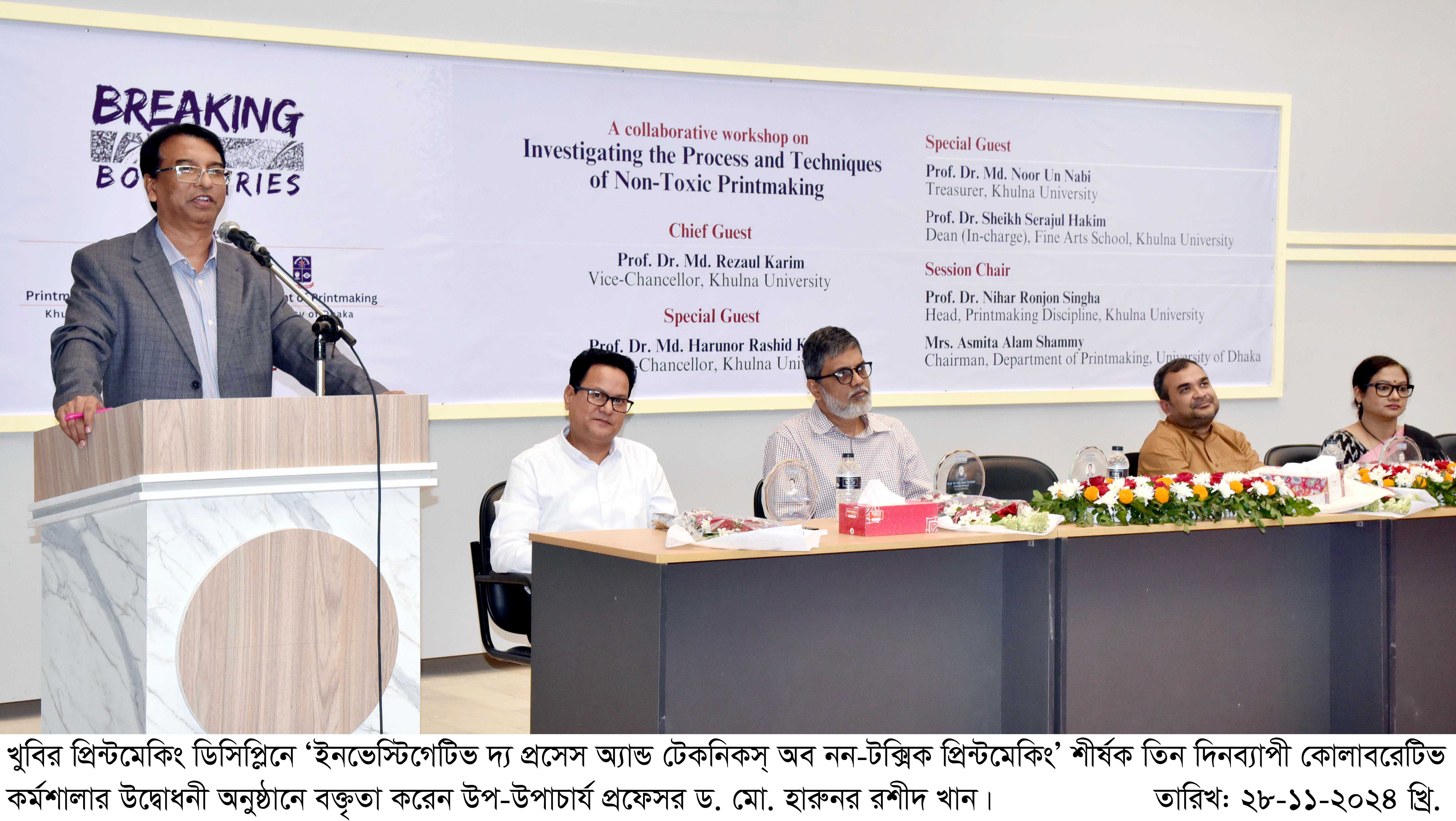 খুলনা বিশ্ববিদ্যালয়ে ‘ইনভেস্টিগেটিভ দ্য প্রসেস অ্যান্ড টেকনিকস্ অব নন-টক্সিক প্রিন্টমেকিং’ শীর্ষক তিন দিনব্যাপী কোলাবরেটিভ কর্মশালা শুরু হয়েছে। আজ বৃহস্পতিবার (২৮ নভেম্বর) দুপুর ১২টায় চারুকলা স্কুলের আঙিনায় এ কর্মশালার উদ্বোধন করেন খুলনা বিশ্ববিদ্যালয়ের উপ-উপাচার্য প্রফেসর ড. মো. হারুনর রশীদ খান।