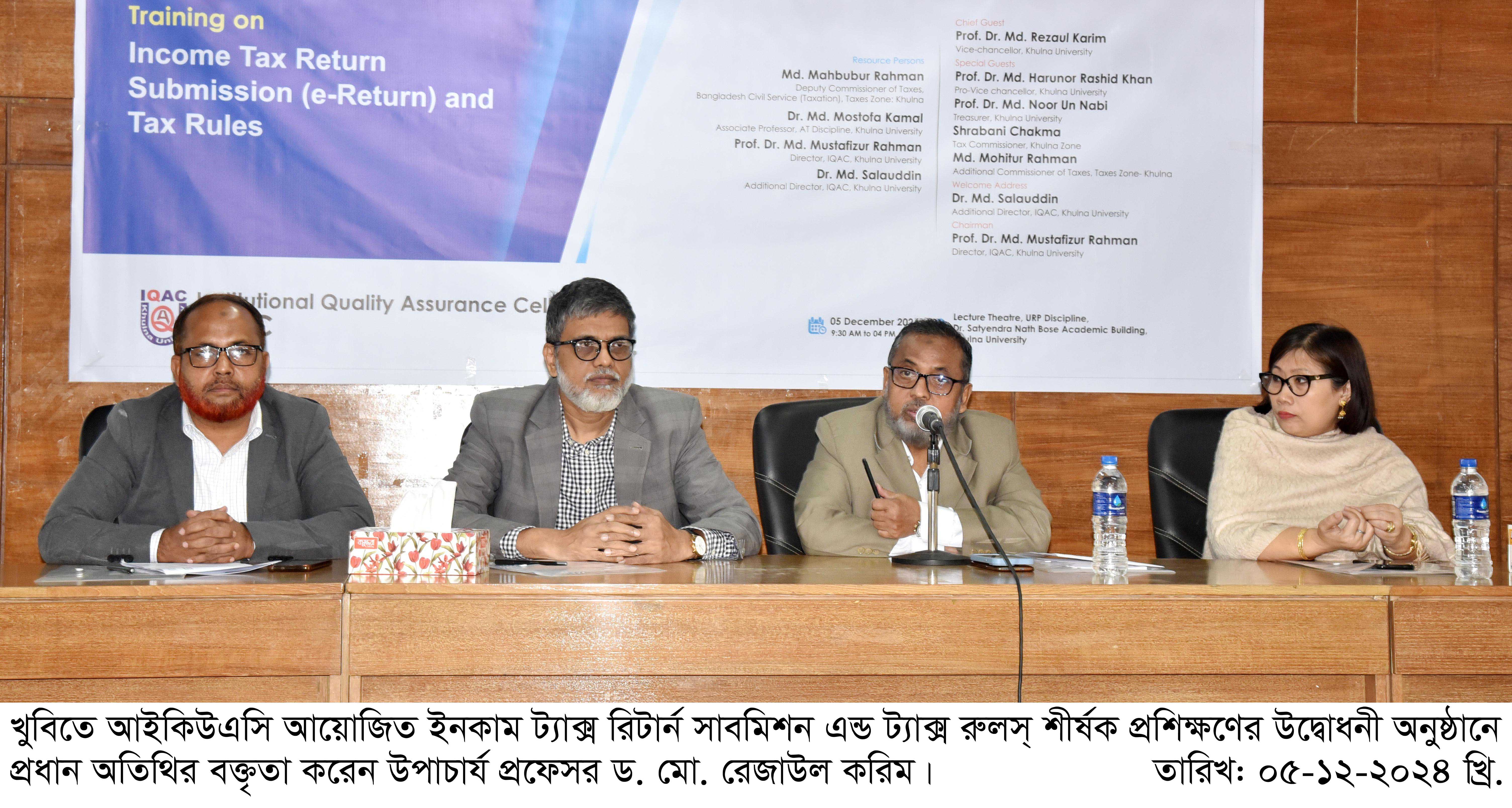 খুলনা বিশ্ববিদ্যালয়ের ইনস্টিটিউশনাল কোয়ালিটি অ্যাসুরেন্স সেলের (আইকিউএসি) উদ্যোগে ‘ইনকাম ট্যাক্স রিটার্ন সাবমিশন (ই-রিটার্ন) এন্ড ট্যাক্স রুলস্’ শীর্ষক এক প্রশিক্ষণ আজ বৃহস্পতিবার (০৫ ডিসেম্বর) অনুষ্ঠিত হয়। সকাল ৯.৩০ মিনিটে ইউআরপি লেকচার থিয়েটারে এ প্রশিক্ষণের উদ্বোধনী অনুষ্ঠানে প্রধান অতিথি হিসেবে বক্তৃতা করেন উপাচার্য প্রফেসর ড. মো. রেজাউল করিম।