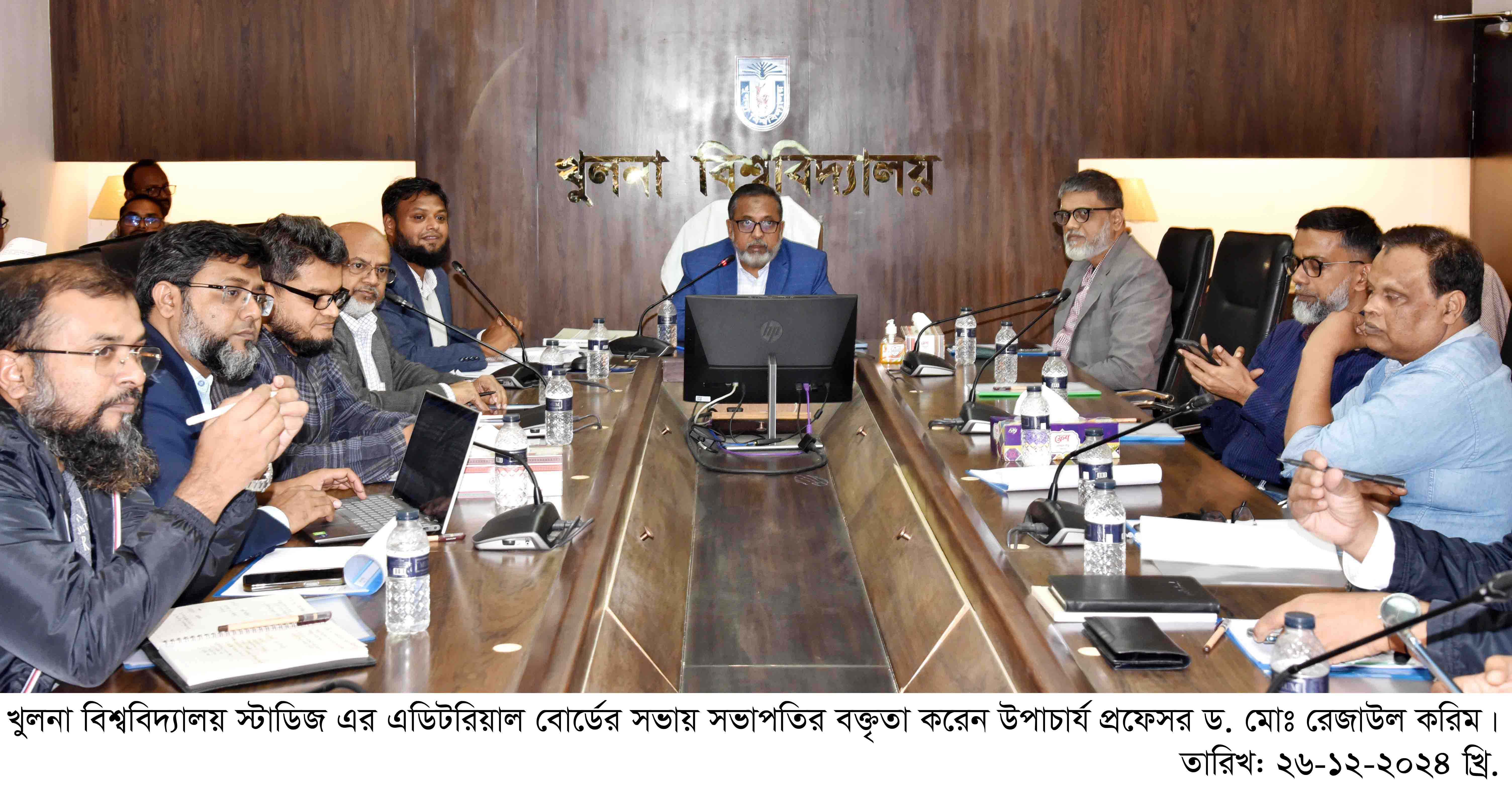 খুলনা বিশ্ববিদ্যালয় (কেইউ) স্টাডিজের এডিটরিয়াল বোর্ডের সভা আজ বৃহস্পতিবার (২৬ ডিসেম্বর) বিকাল ৪টায় শহিদ তাজউদ্দীন আহমদ প্রশাসনিক ভবনের সভাকক্ষে অনুষ্ঠিত হয়। সভায় সভাপতিত্ব করেন খুলনা বিশ্ববিদ্যালয় স্টাডিজের এডিটর ইন চিফ উপাচার্য প্রফেসর ড. মোঃ রেজাউল করিম।