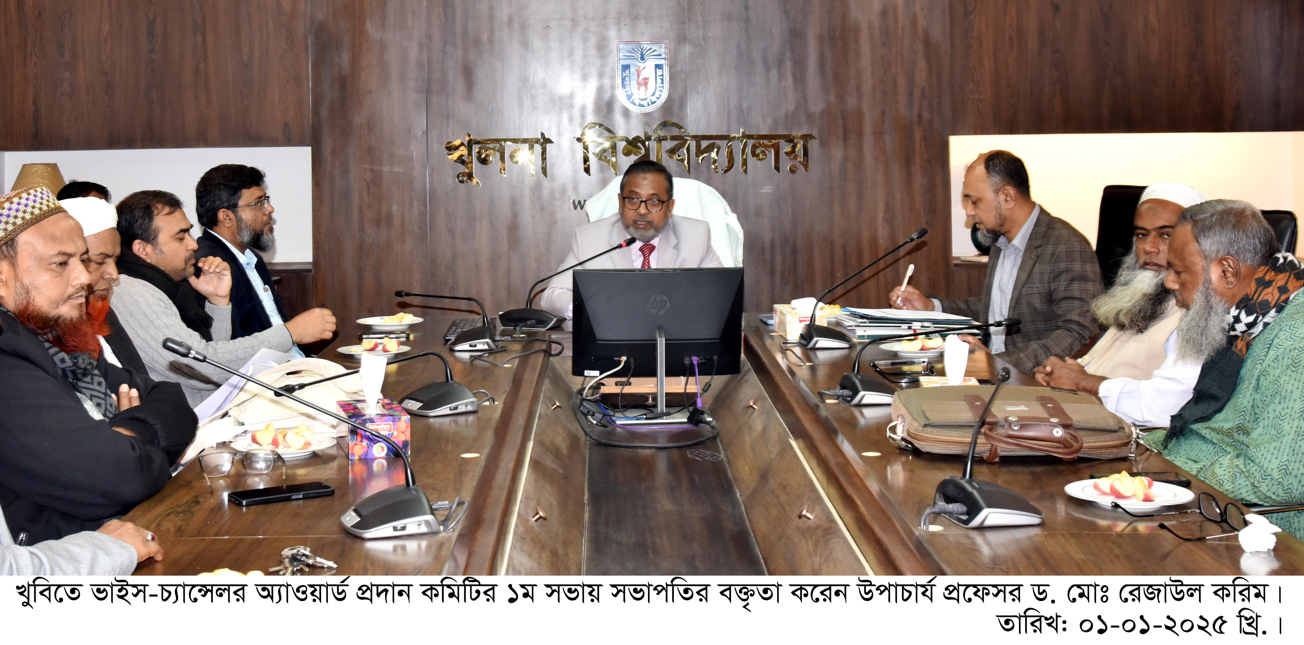গবেষণায় বিশেষ অবদানের স্বীকৃতিস্বরূপ প্রতি বছর খুলনা বিশ্ববিদ্যালয়ের সকল স্কুলের শিক্ষকদের মধ্য থেকে সর্বোচ্চ আট জন শিক্ষককে ভাইস-চ্যান্সেলর অ্যাওয়ার্ড প্রদান করা হয়। এ কার্যক্রম বাস্তবায়নের লক্ষ্যে আজ ১ জানুয়ারি (বুধবার) সকাল ১০ টায় বিশ্ববিদ্যালয়ের শহিদ তাজউদ্দীন আহমদ প্রশাসনিক ভবনের সম্মেলন কক্ষে ভাইস-চ্যান্সেলর অ্যাওয়ার্ড প্রদান কমিটির ১ম সভা অনুষ্ঠিত হয়। সভায় সভাপতিত্ব করেন উপাচার্য প্রফেসর ড. মো. রেজাউল করিম। তিনি বলেন, শিক্ষা, গবেষণা ও অন্যান্য কর্মকাণ্ডের মাধ্যমে বিশ্ববিদ্যালয়কে এগিয়ে নেওয়ার ক্ষেত্রে শিক্ষকদের অবদান গুরুত্বপূর্ণ। তাদের নিরলস প্রচেষ্টায় খুলনা বিশ্ববিদ্যালয় ইতোমধ্যে শিক্ষা-গবেষণায় একটি অবস্থান তৈরি করে নিতে সক্ষম হয়েছে। তাঁদের এ অবদানকে যথাযথভাবে মূল্যায়ণ এবং আরও বেশি উৎসাহিত করার জন্যই এই ভাইস-চ্যান্সেলর অ্যাওয়ার্ড। তিনি সংশ্লিষ্টদের প্রতি সঠিকভাবে উপযুক্ত অ্যাওয়ার্ডি মনোনয়ন জন্য নির্দেশনা প্রদান করেন।