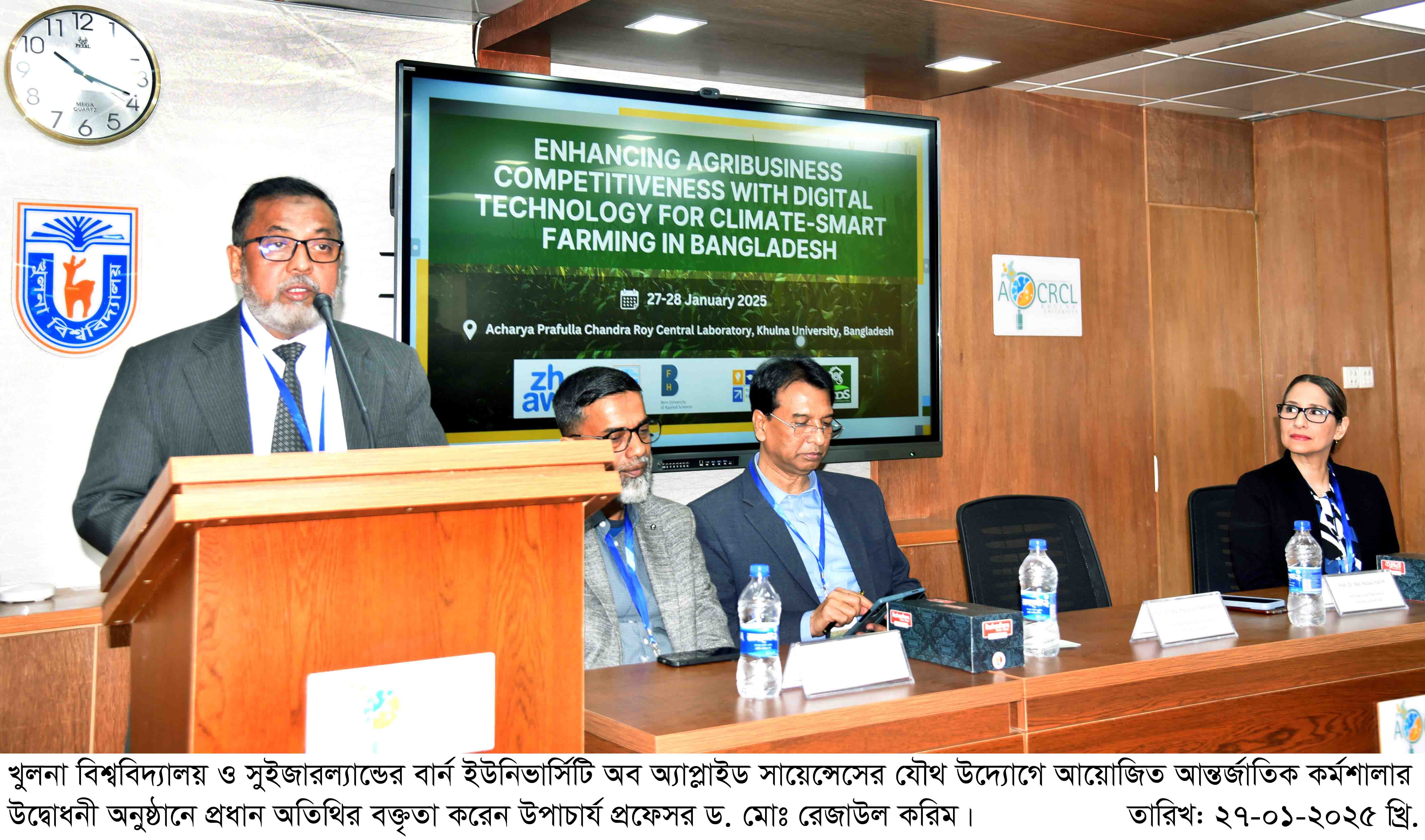খুলনা বিশ্ববিদ্যালয় ও সুইজারল্যান্ডের বার্ন ইউনিভার্সিটি অব অ্যাপ্লাইড সায়েন্সেসের যৌথ উদ্যোগে ‘এনহ্যান্সিং এগ্রিবিজনেস কম্পিটিটিভনেস উইথ ডিজিটাল টেকনোলজি ফর ক্লাইমেট-স্মার্ট ফার্মিং ইন বাংলাদেশ’ শীর্ষক দু’দিনব্যাপী এক আন্তর্জাতিক কর্মশালা শুরু হয়েছে। এই কর্মশালার ফোকাল পারসন হিসেবে রয়েছেন খুলনা বিশ্ববিদ্যালয়ের ব্যবসায় প্রশাসন ডিসিপ্লিনের প্রফেসর ড. মোঃ নূরুন্নবী এবং সুইজারল্যান্ডের বার্ন ইউনিভার্সিটি অব অ্যাপ্লাইড সায়েন্সেসের ড. ইনগ্রিড ফ্রম। তাদের যৌথ উদ্যোগে এই কর্মশালাটি আয়োজন করা হয়েছে। যেখানে কারিগরি ও আথিক সহায়তা প্রদান করছেন সুইজারল্যান্ডভিত্তিক প্রতিষ্ঠান ZHAW এবং বাংলাদেশি একটি উন্নয়ন সংস্থা BEDS।