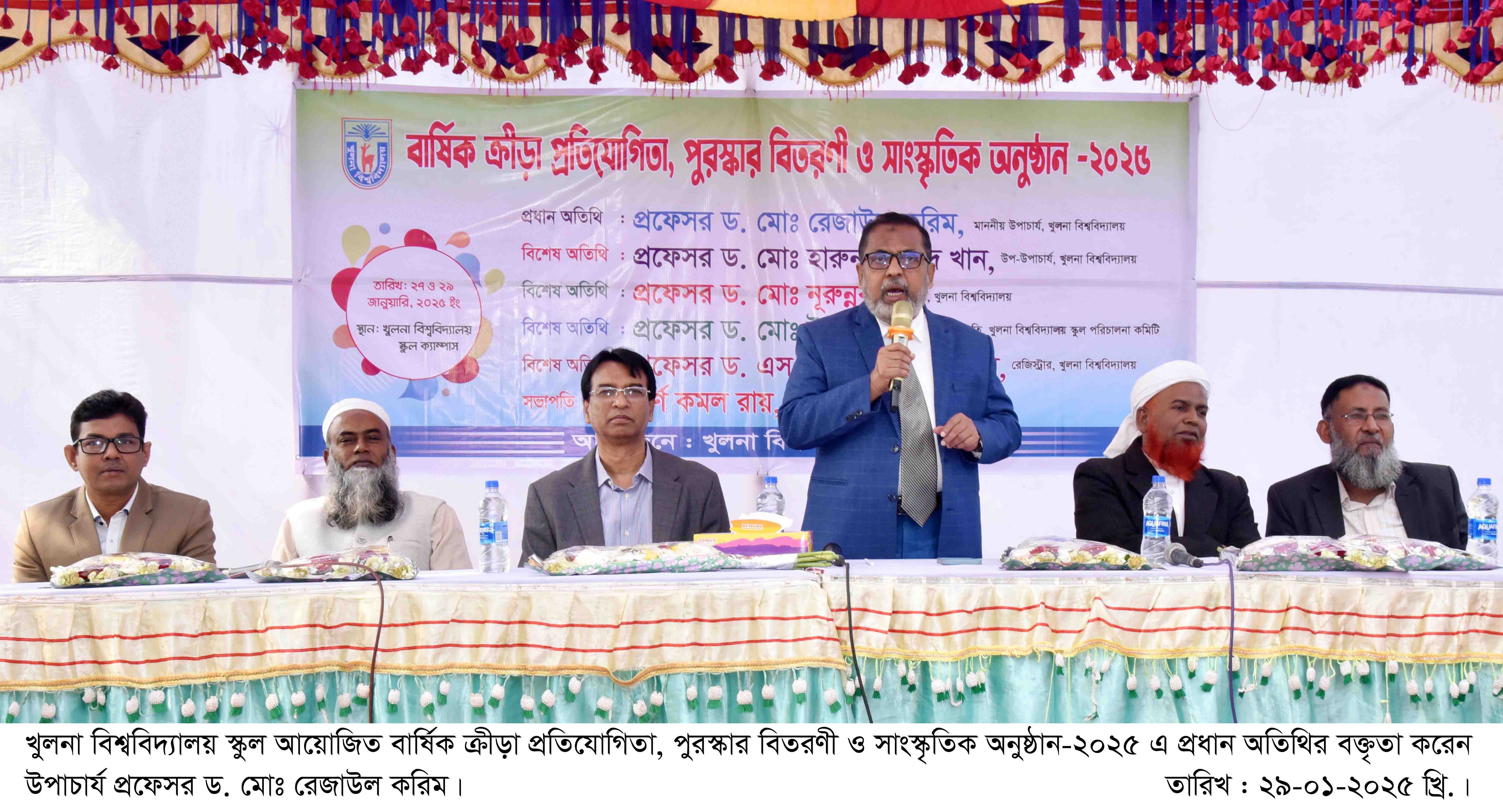 খুলনা বিশ্ববিদ্যালয় স্কুলের বার্ষিক ক্রীড়া ও সাংস্কৃতিক প্রতিযোগিতা আজ বুধবার (২৯ জানুয়ারি) অনুষ্ঠিত হয়। সকালে প্রধান অতিথি হিসেবে ফিতা কেটে বার্ষিক ক্রীড়া প্রতিযোগিতার উদ্বোধন করেন উপাচার্য প্রফেসর ড. মোঃ রেজাউল করিম। তিনি বলেন, শিক্ষার্থীদের শারীরিক ও মানসিক বিকাশে খেলাধুলার কোনো বিকল্প নেই। তাই একাডেমিক ফলাফলের পাশাপাশি ক্রীড়া ও সাংস্কৃতিক চর্চায়ও শিক্ষার্থীদের অবদান রাখতে হবে। কারণ, স্কুলের সুনাম ও ভাবমূর্তি প্রকাশ পায় শিক্ষার্থীদের পারফরমেন্সের মাধ্যমে।