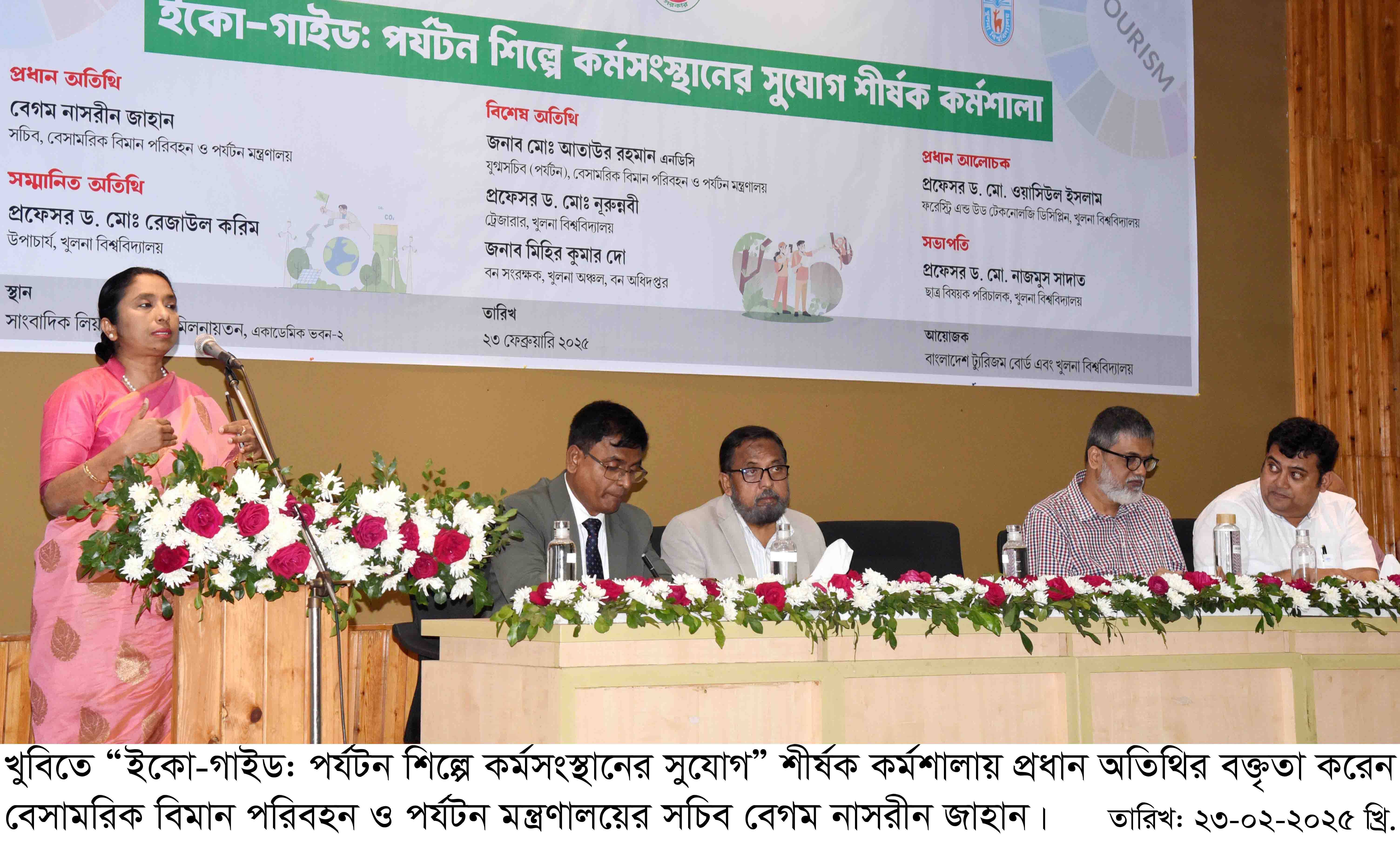 আজ ২৩ ফেব্রুয়ারি (রবিবার) বিকাল ৩টা ৩০ মিনিটে খুলনা বিশ্ববিদ্যালয়ের সাংবাদিক লিয়াকত আলী মিলনায়তনে ‘ইকো-গাইড: পর্যটন শিল্পে কর্মসংস্থানের সুযোগ’ শীর্ষক কর্মশালার উদ্বোধনী অনুষ্ঠানে প্রধান অতিথির বক্তৃতায় তিনি এ কথা বলেন। বাংলাদেশে ট্যুরিজম বোর্ড ও খুলনা বিশ্ববিদ্যালয়ের ছাত্র বিষয়ক পরিচালকের দপ্তর এ কর্মশালা আয়োজন করে।