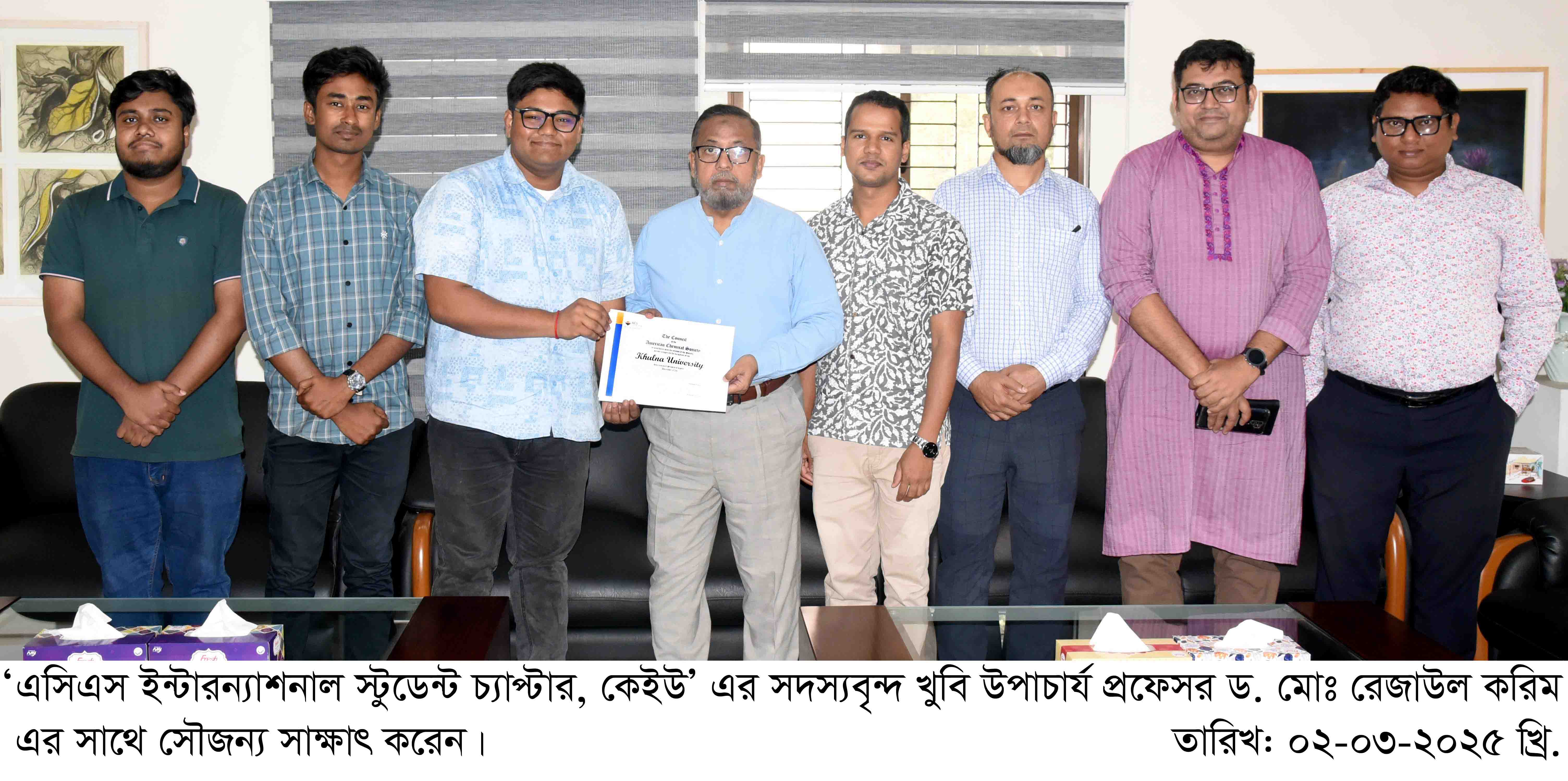 খুলনা বিশ্ববিদ্যালয়ে আনুষ্ঠানিকভাবে যাত্রা শুরু করলো আমেরিকান কেমিক্যাল সোসাইটি (এসিএস) এর সার্টিফাইড এবং চার্টার্ড সংগঠন ‘এসিএস ইন্টারন্যাশনাল স্টুডেন্ট চ্যাপ্টার, কেইউ’। আজ ০২ মার্চ (রবিবার) দুপুরে উপাচার্য প্রফেসর ড. মোঃ রেজাউল করিম এর সাথে সৌজন্য সাক্ষাৎ করেন সম্প্রতি অনুমোদন পাওয়া এ সংগঠনের সদস্যবৃন্দ।
