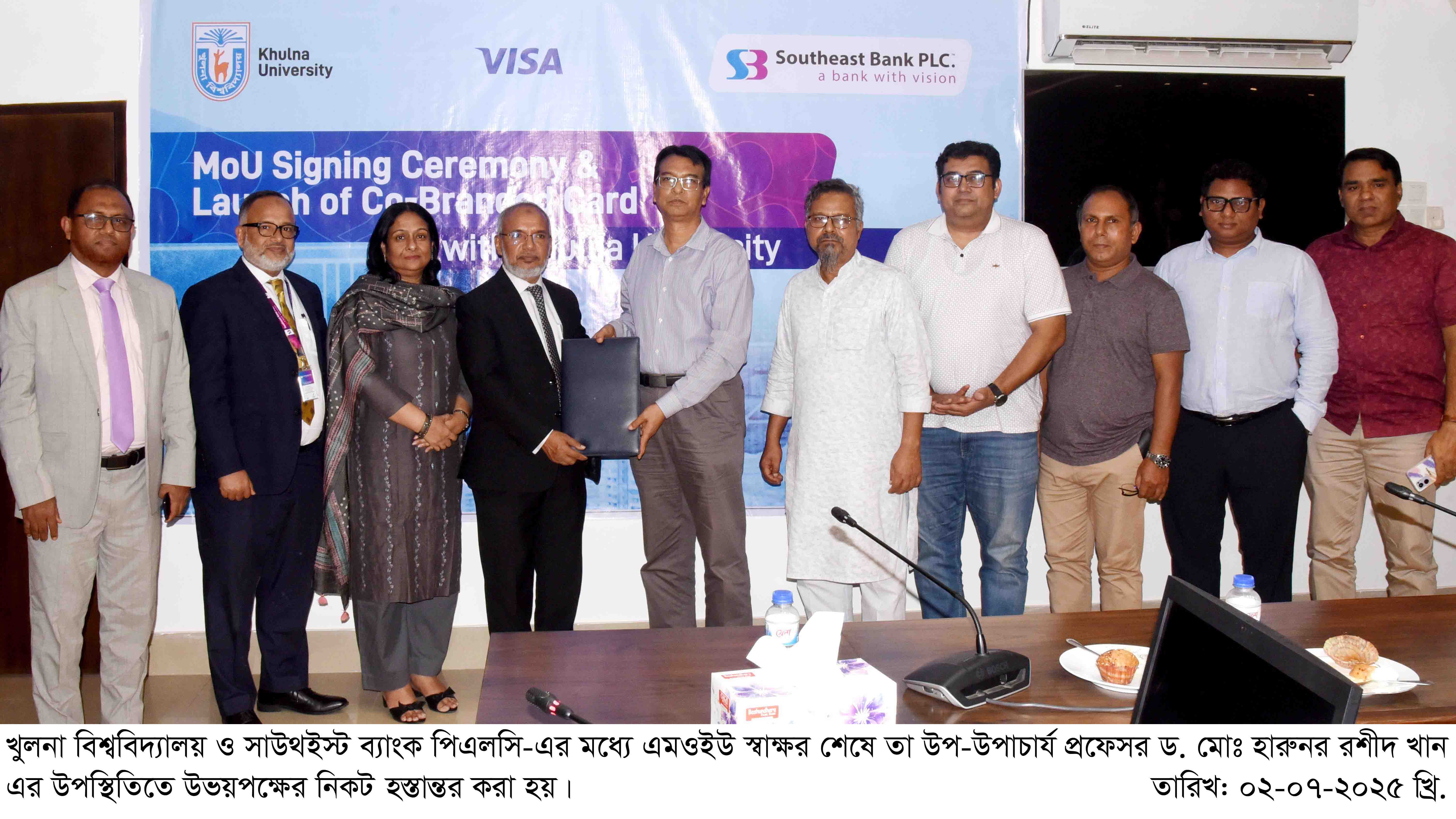 খুলনা বিশ্ববিদ্যালয় ও সাউথইস্ট ব্যাংক পিএলসি-এর মধ্যে আজ ০২ জুলাই (বুধবার) একটি সমঝোতা স্মারক (এমওইউ) স্বাক্ষরিত হয়েছে। বিশ্ববিদ্যালয়ের শিক্ষার্থী ও শিক্ষক-কর্মকর্তাদের আর্থিক ও জীবনধারাভিত্তিক সেবা সহজতর করতে যৌথভাবে এই উদ্যোগ গ্রহণ করা হয়েছে। বিশ্ববিদ্যালয়ের পক্ষে উপ-উপাচার্য প্রফেসর ড. মোঃ হারুনর রশীদ খান ও সাউথইস্ট ব্যাংক পিএলসি-এর পক্ষে সিনিয়র এক্সিকিউটিভ ভাইস প্রেসিডেন্ট এবং হেড অব কার্ডস মোঃ আব্দুস সবুর খান এই এমওইউতে স্বাক্ষর করেন।