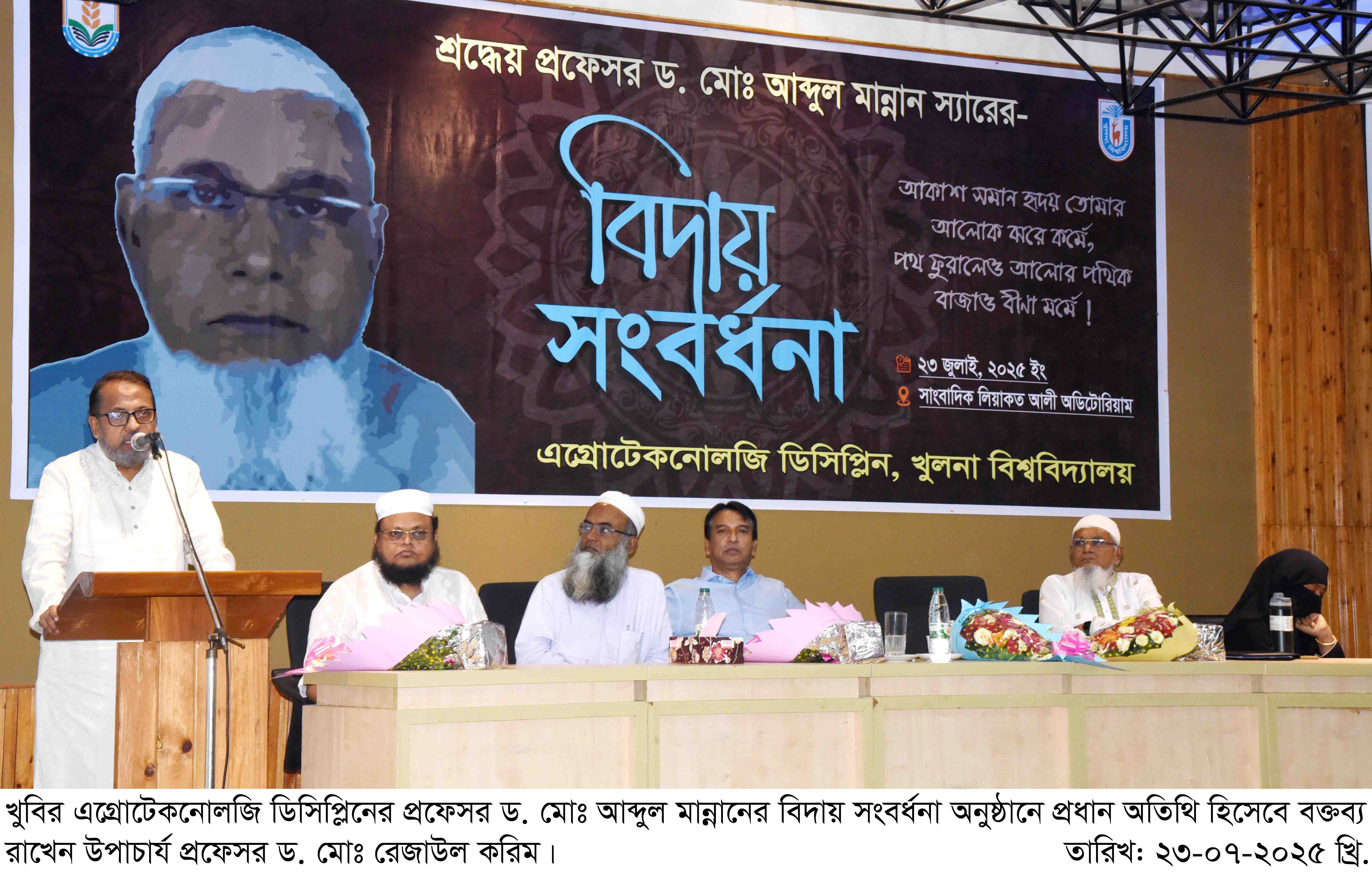 খুলনা বিশ্ববিদ্যালয়ের এগ্রোটেকনোলজি ডিসিপ্লিনের শিক্ষক প্রফেসর ড. মোঃ আব্দুল মান্নান এর কর্মজীবন সফলভাবে সম্পন্ন হওয়ায় আজ ২৩ জুলাই (মঙ্গলবার) সকাল ৯.৩০ মিনিটে সাংবাদিক লিয়াকত আলী মিলনায়তনে ডিসিপ্লিনের উদ্যোগে এক বিদায় সংবর্ধনা অনুষ্ঠিত হয়। অনুষ্ঠানের শুরুতে রাজধানীর উত্তরায় মাইলস্টোন স্কুল এন্ড কলেজে বিমান দুর্ঘটনায় হতাহতদের স্মরণে দাঁড়িয়ে এক মিনিট নিরবতা পালন করা হয়।