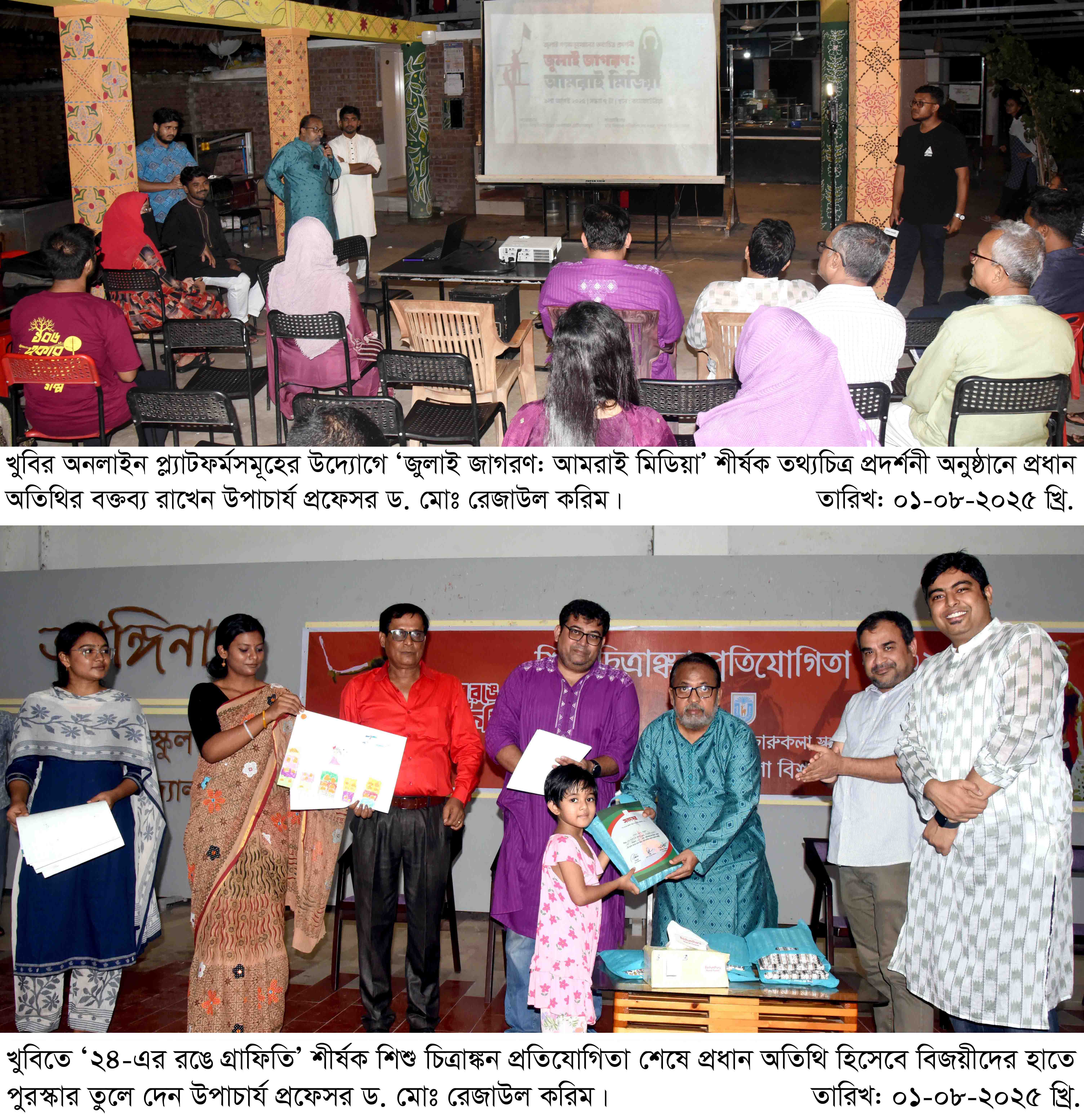 খুলনা বিশ্ববিদ্যালয়ের অনলাইন প্ল্যাটফর্মসমূহের উদ্যোগে ‘জুলাই জাগরণ: আমরাই মিডিয়া’ শীর্ষক তথ্যচিত্র প্রদর্শনী অনুষ্ঠিত হয়েছে। আজ ০১ আগস্ট (শুক্রবার) সন্ধ্যা ৭টা ৩০ মিনিটে বিশ্ববিদ্যালয়ের ক্যাফেটেরিয়া প্রাঙ্গণে আয়োজিত এই প্রদর্শনীতে প্রধান অতিথি হিসেবে উপস্থিত ছিলেন উপাচার্য প্রফেসর ড. মোঃ রেজাউল করিম।