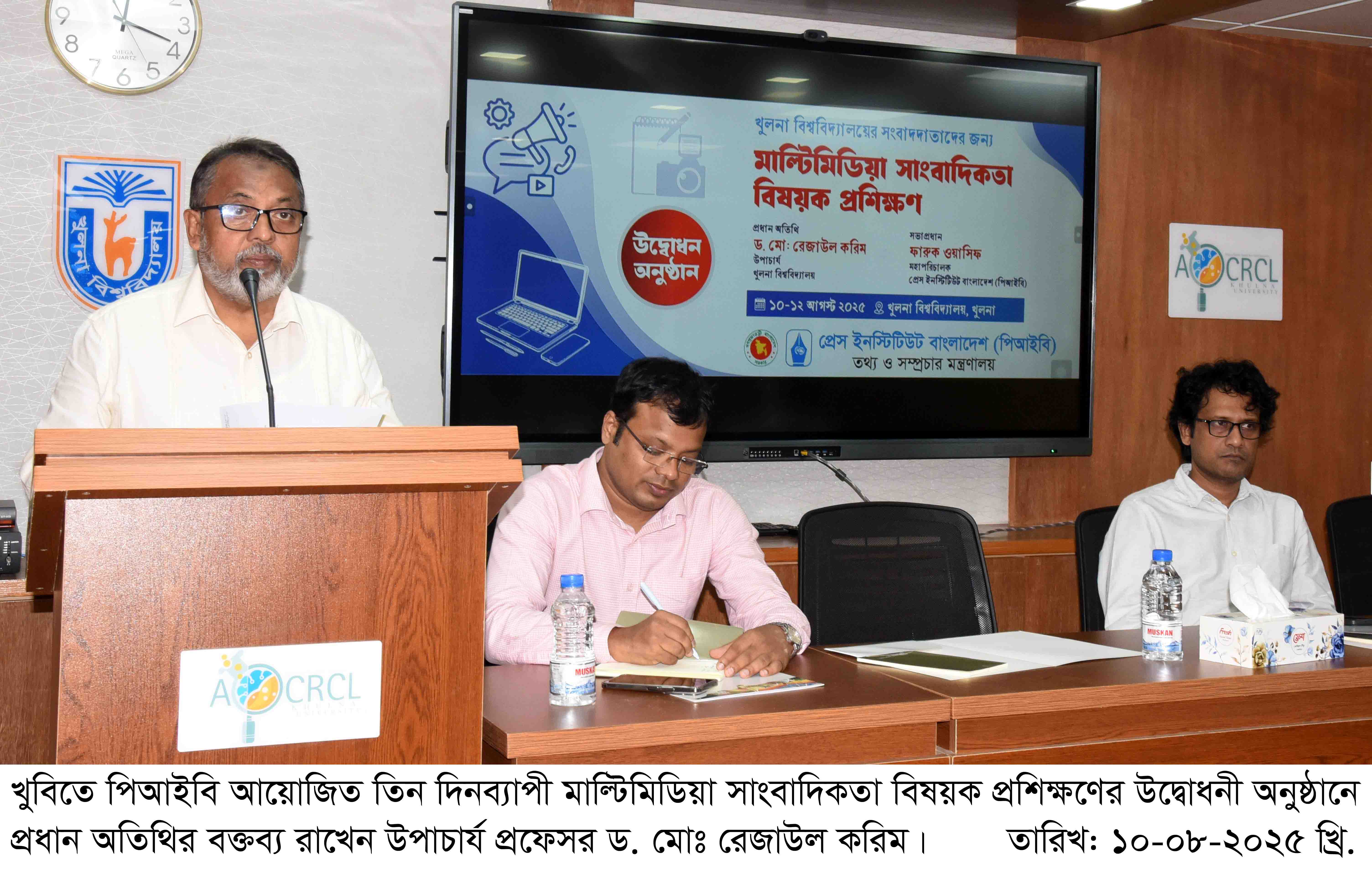 প্রেস ইনস্টিটিউট বাংলাদেশ (পিআইবি)-এর উদ্যোগে খুলনা বিশ্ববিদ্যালয়ে তিন দিনব্যাপী মাল্টিমিডিয়া সাংবাদিকতা বিষয়ক প্রশিক্ষণ শুরু হয়েছে। আজ ১০ আগস্ট (রবিবার) বেলা সাড়ে ১১টায় বিশ্ববিদ্যালয়ের কেন্দ্রীয় গবেষণাগারের সম্মেলন কক্ষে এই প্রশিক্ষণের উদ্বোধনী অনুষ্ঠানে প্রধান অতিথি ছিলেন উপাচার্য প্রফেসর ড. মোঃ রেজাউল করিম।