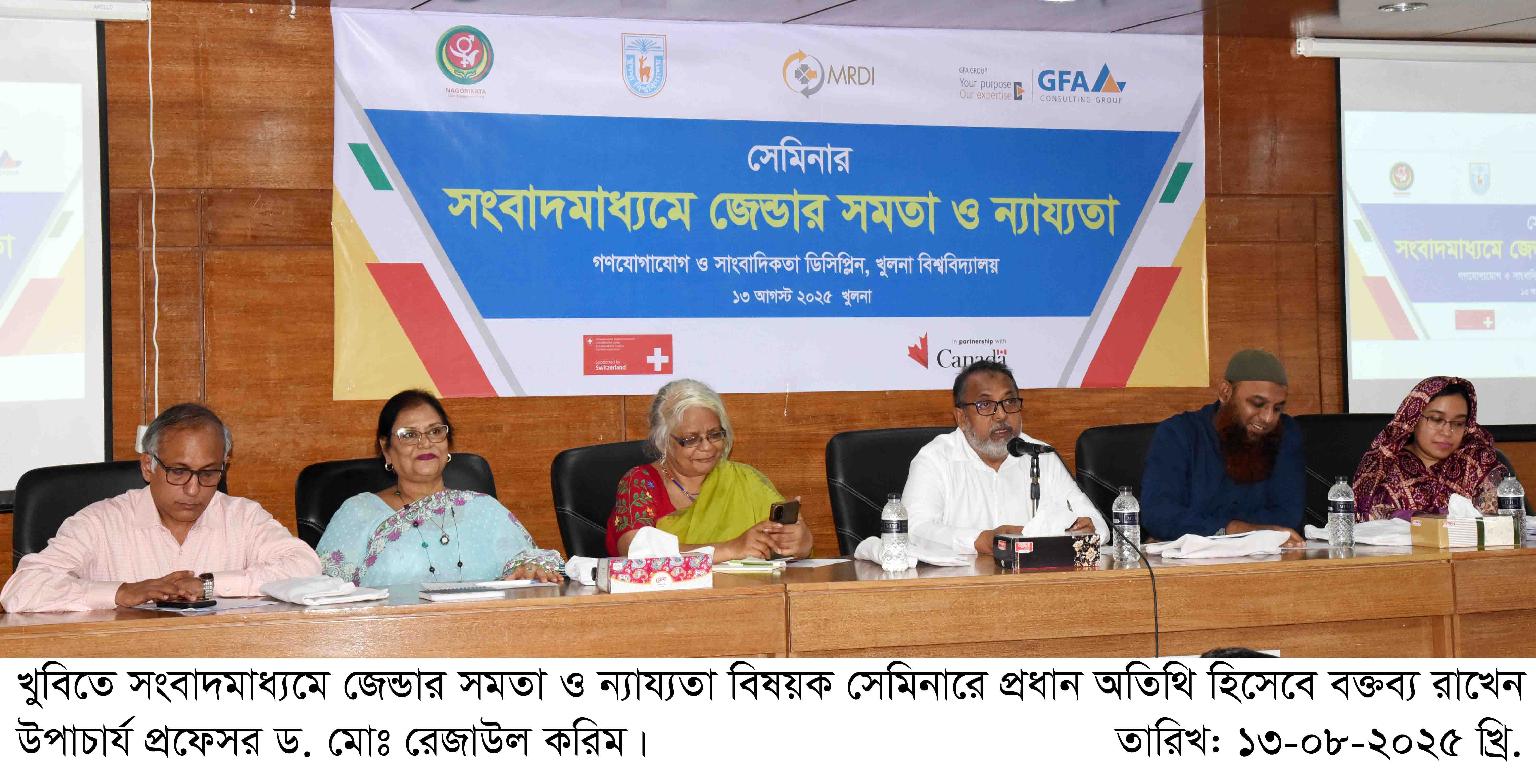 খুলনা বিশ্ববিদ্যালয়ের গণযোগাযোগ ও সাংবাদিকতা (এমসিজে) ডিসিপ্লিনের উদ্যোগে ‘সংবাদমাধ্যমে জেন্ডার সমতা ও ন্যায্যতা’ বিষয়ে এক সেমিনার আজ ১৩ আগস্ট (বুধবার) অনুষ্ঠিত হয়। সকাল ৯.৩০ মিনিটে ইউআরপি লেকচার থিয়েটারে এ সেমিনারে প্রধান অতিথি হিসেবে বক্তব্য রাখেন উপাচার্য প্রফেসর ড. মোঃ রেজাউল করিম।