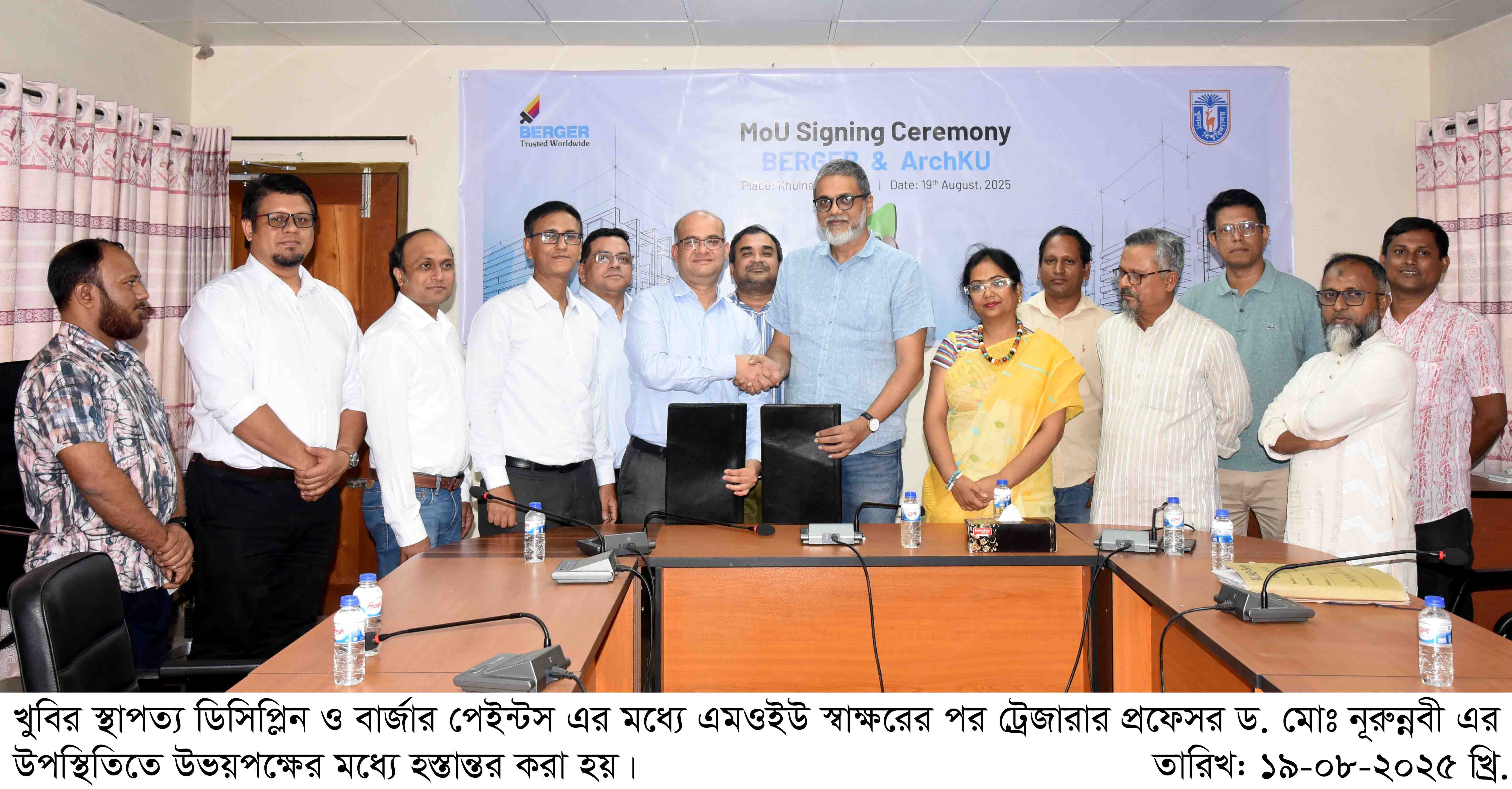 খুলনা বিশ্ববিদ্যালয়ের স্থাপত্য ডিসিপ্লিন ও বার্জার পেইন্টস বাংলাদেশ লিমিটেডের মধ্যে একাডেমিয়া-ইন্ডাস্ট্রি নেক্সাস প্রতিষ্ঠায় একটি সমঝোতা স্মারক (এমওইউ) স্বাক্ষরিত হয়েছে। এর মাধ্যমে বিশ্ববিদ্যালয়ের শিক্ষার্থীরা শিল্পখাতের সঙ্গে যুক্ত থেকে বাস্তব অভিজ্ঞতা অর্জনের সুযোগ পাবেন এবং একাডেমিক উৎকর্ষ সাধনের নতুন দিগন্ত উন্মোচিত হবে।