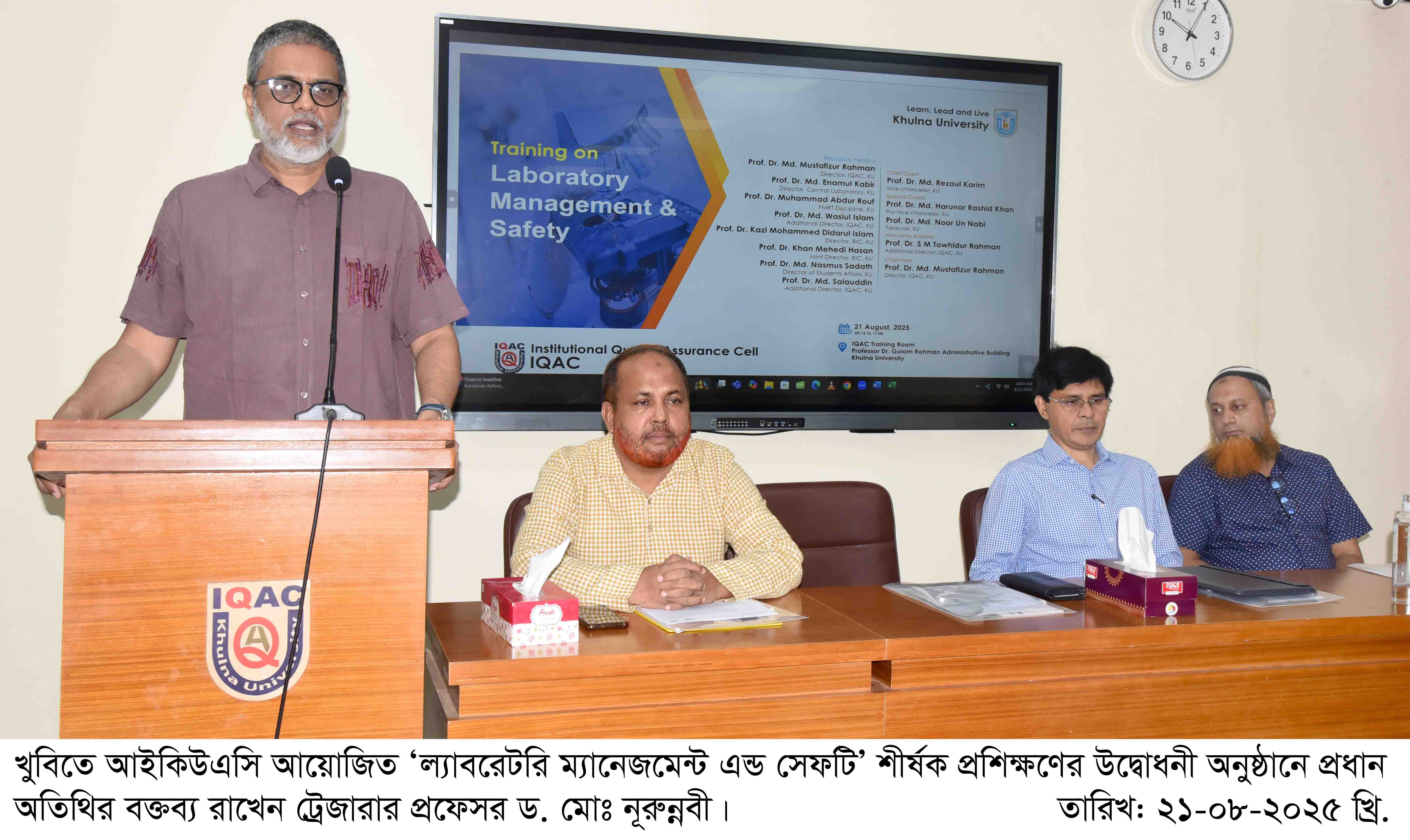 খুলনা বিশ্ববিদ্যালয়ের ইনস্টিটিউশনাল কোয়ালিটি অ্যাসুরেন্স সেল (আইকিউএসি)-এর উদ্যোগে ‘ল্যাবরেটরি ম্যানেজমেন্ট এন্ড সেফটি’ শীর্ষক দিনব্যাপী এক প্রশিক্ষণ অনুষ্ঠিত হয়েছে। আজ ২১ আগস্ট (বৃহস্পতিবার) সকালে এ প্রশিক্ষণের উদ্বোধনী অনুষ্ঠানে প্রধান অতিথির বক্তব্য রাখেন ট্রেজারার প্রফেসর ড. মোঃ নূরুন্নবী।