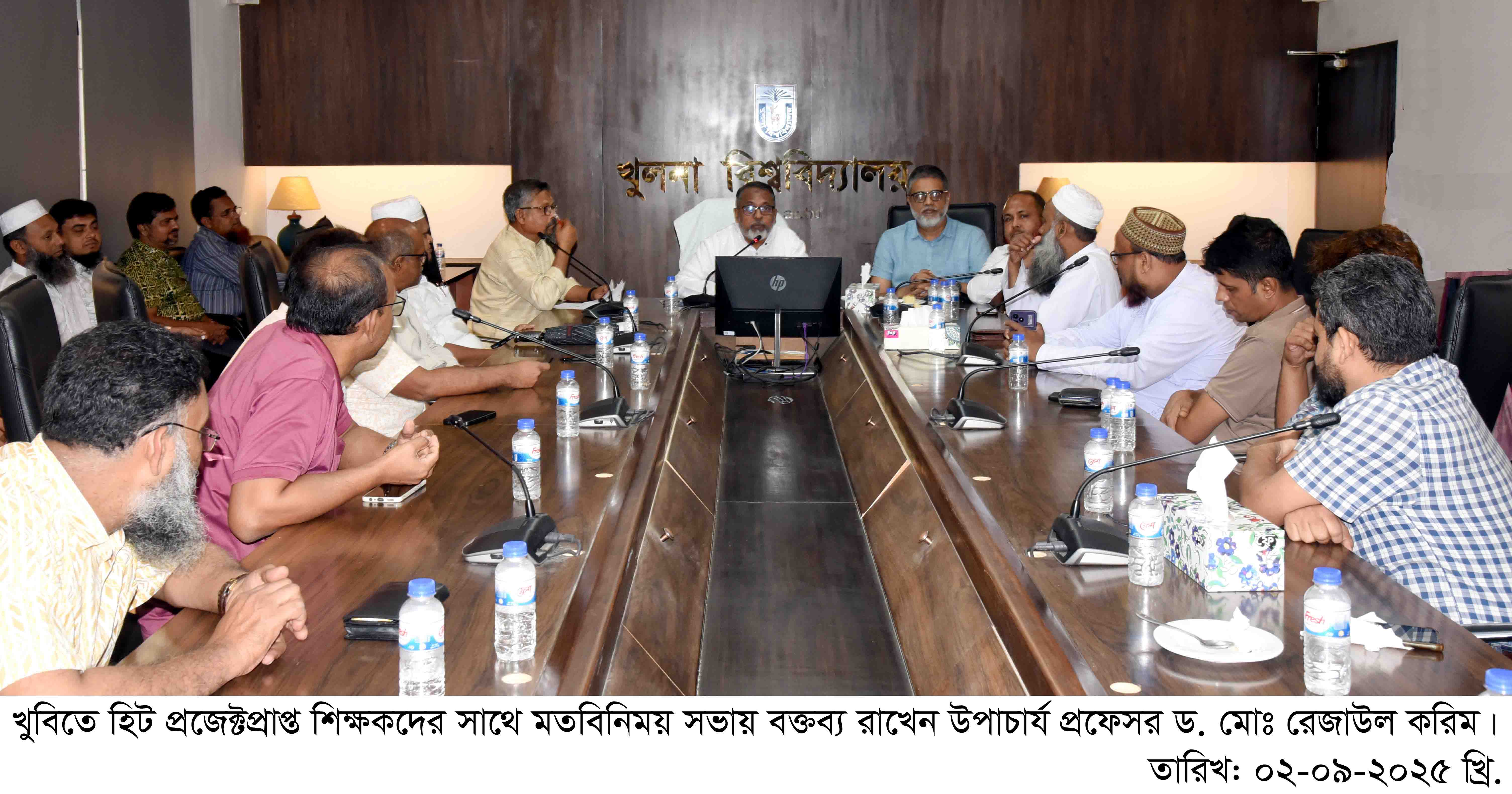 খুলনা বিশ্ববিদ্যালয়ের উপাচার্য প্রফেসর ড. মোঃ রেজাউল করিম এর সাথে বিশ্ববিদ্যালয় মঞ্জুরি কমিশনের (ইউজিসি) ‘হায়ার এডুকেশন এক্সেলারেশন এন্ড টেকনোলজি (হিট)’ প্রজেক্টপ্রাপ্ত শিক্ষকবৃন্দ মতবিনিময় করেছেন। আজ ০২ সেপ্টেম্বর (মঙ্গলবার) সকালে প্রশাসনিক ভবনের সভাকক্ষে এ মতবিনিময় সভা অনুষ্ঠিত হয়।