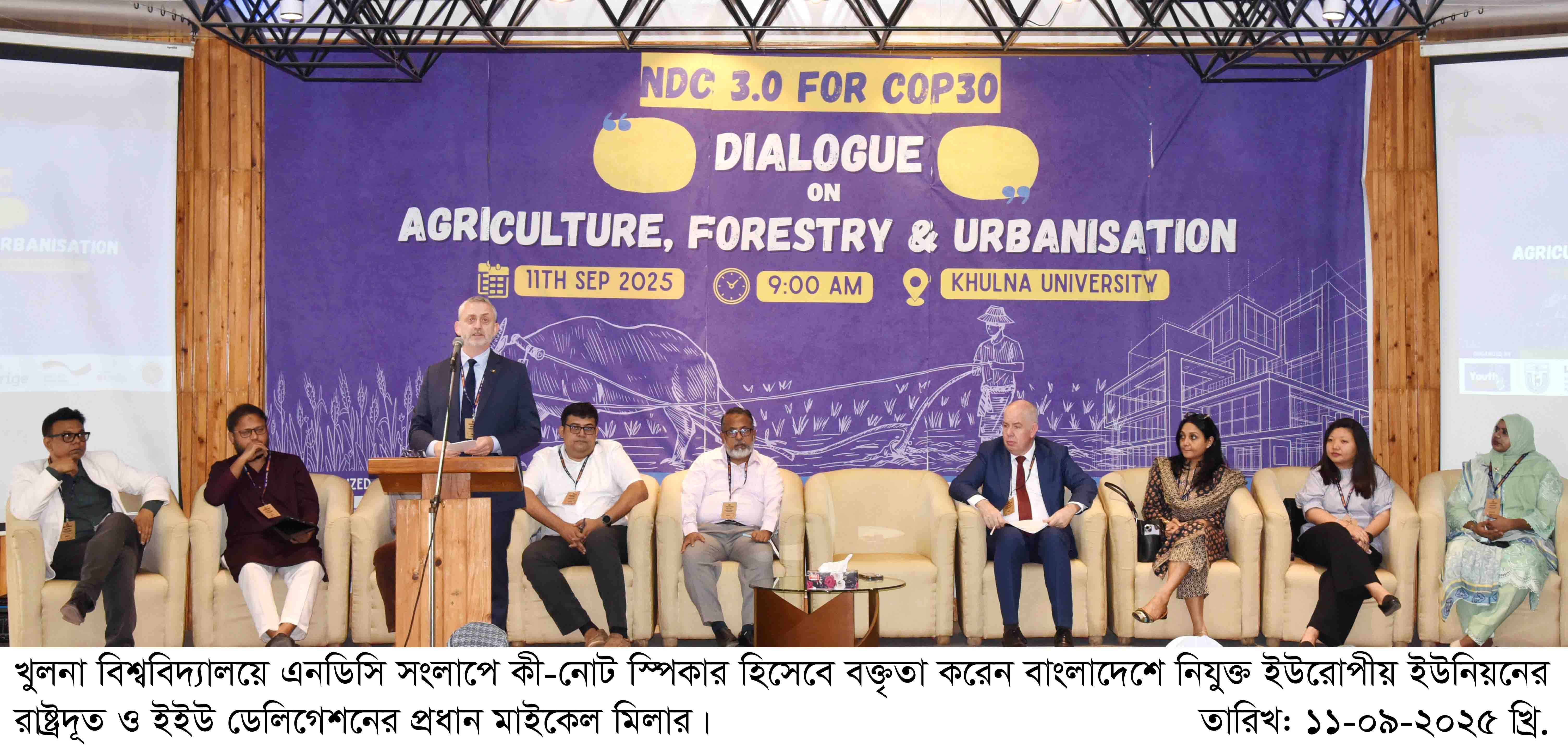 আজ ১১ সেপ্টেম্বর (বৃহস্পতিবার) সকালে খুলনা বিশ্ববিদ্যালয়ের সাংবাদিক লিয়াকত আলী মিলনায়তনে "NDC 3.0 for COP30: Dialogue on Agriculture, Forestry & Urbanisation" শীর্ষক সংলাপে কী-নোট স্পিকার হিসেবে বক্তৃতাকালে তিনি এ কথা বলেন। খুলনা বিশ্ববিদ্যালয়, বাংলাদেশ ইনস্টিটিউট অব প্ল্যানার্স-বিআইপি ও ইয়ুথ ফর এনডিসি যৌথভাবে এ প্রোগ্রাম আয়োজন করে।