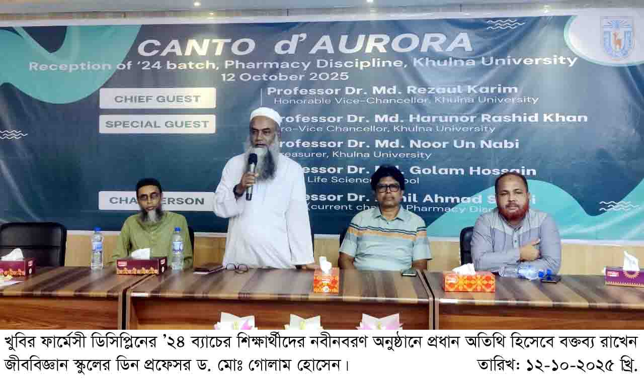 খুলনা বিশ্ববিদ্যালয়ের ফার্মেসী ডিসিপ্লিনের ’২৪ ব্যাচের শিক্ষার্থীদের নবীনবরণ আজ ১২ অক্টোবর (রবিবার) দুপুর ১২টায় ৩নং একাডেমিক ভবনের মাল্টিপারপাস রুমে অনুষ্ঠিত হয়। অনুষ্ঠানে প্রধান অতিথি হিসেবে বক্তব্য রাখেন জীববিজ্ঞান স্কুলের ডিন প্রফেসর ড. মোঃ গোলাম হোসেন।