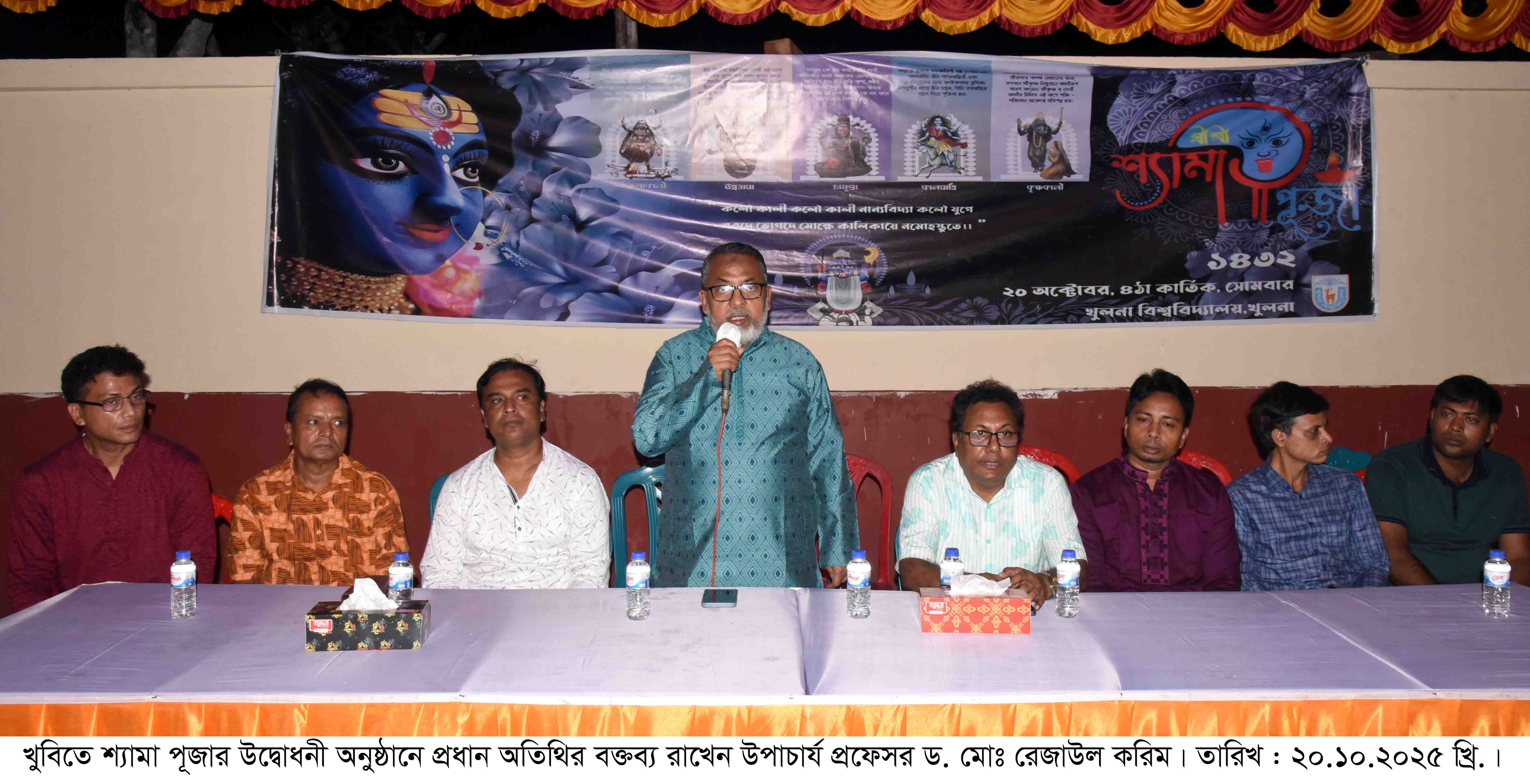রাত ৮টায় শ্যামা পূজা উপলক্ষ্যে মন্দির প্রাঙ্গণে উদ্বোধনী অনুষ্ঠানের আয়োজন করা হয়। এতে প্রধান অতিথি হিসেবে বক্তব্য রাখেন খুলনা বিশ্ববিদ্যালয়ের উপাচার্য প্রফেসর ড. মোঃ রেজাউল করিম। তিনি বলেন, খুলনা বিশ্ববিদ্যালয় সব ধর্মের অনুসারীদের জন্য সমান মর্যাদা ও স্বাধীনতার জায়গা। এখানকার সবচেয়ে বড় শক্তি হলো সৌহার্দ্য ও সহাবস্থান। আমরা এমন একটি বিশ্ববিদ্যালয় গড়ে তুলতে চাই; যেখানে মানবিকতা, শ্রদ্ধা ও ঐক্যই হবে একমাত্র বন্ধন।