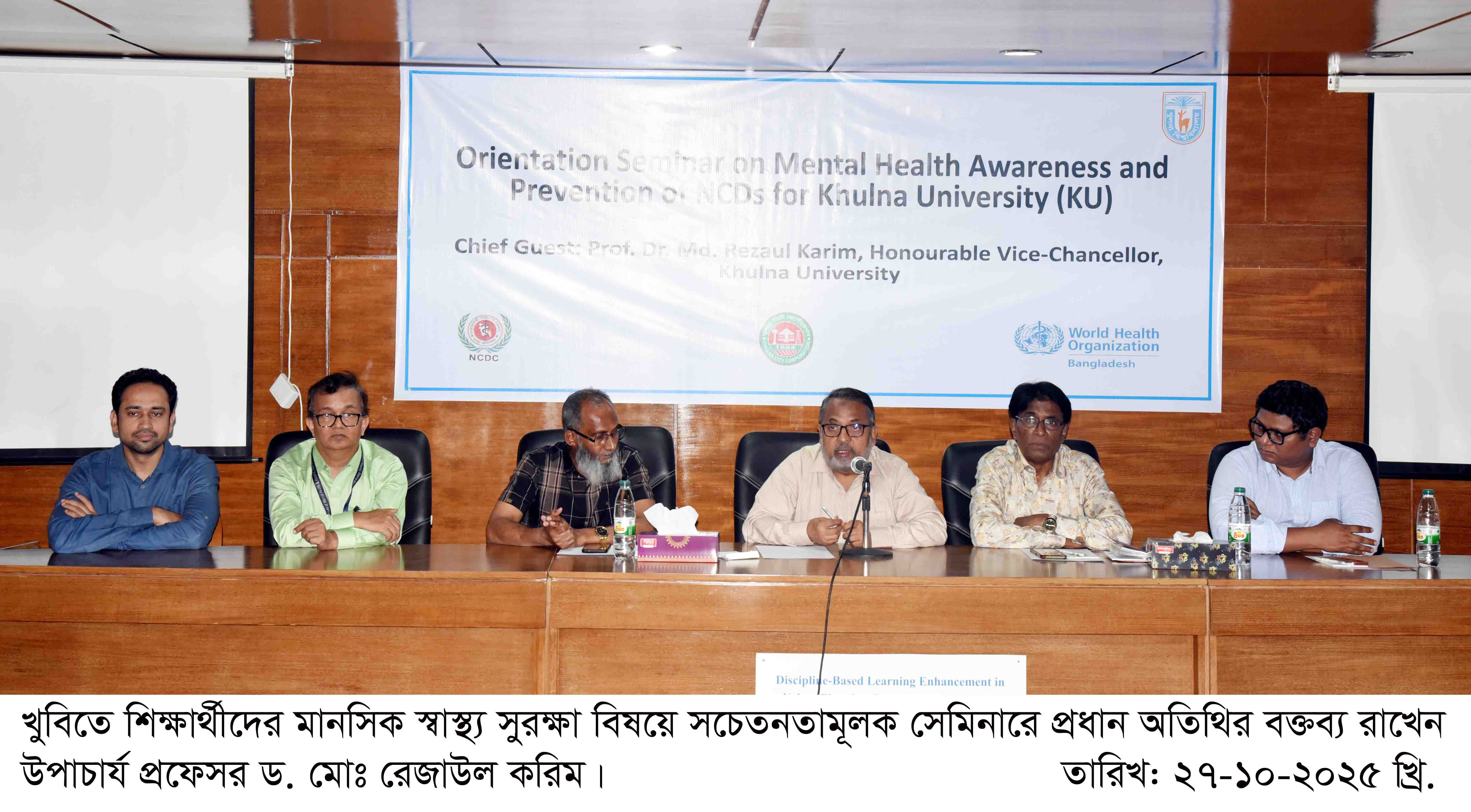 খুলনা বিশ্ববিদ্যালয়ে শিক্ষার্থীদের মানসিক স্বাস্থ্য সুরক্ষায় সচেতনতা তৈরির লক্ষ্যে এক সেমিনার অনুষ্ঠিত হয়েছে। আজ ২৭ অক্টোবর (সোমবার) সকাল সাড়ে ১০টা থেকে দুপুর ২টা ৩০ মিনিট পর্যন্ত বিশ্ববিদ্যালয়ের ইউআরপি ডিসিপ্লিনের লেকচার থিয়েটারে এ সেমিনার আয়োজন করা হয়। বিশ্ব স্বাস্থ্য সংস্থা (ডব্লিউএইচও) ও খুলনা বিশ্ববিদ্যালয়ের যৌথ উদ্যোগে এবং খুলনা সিটি কর্পোরেশনের সহযোগিতায় সেমিনারটি অনুষ্ঠিত হয়।