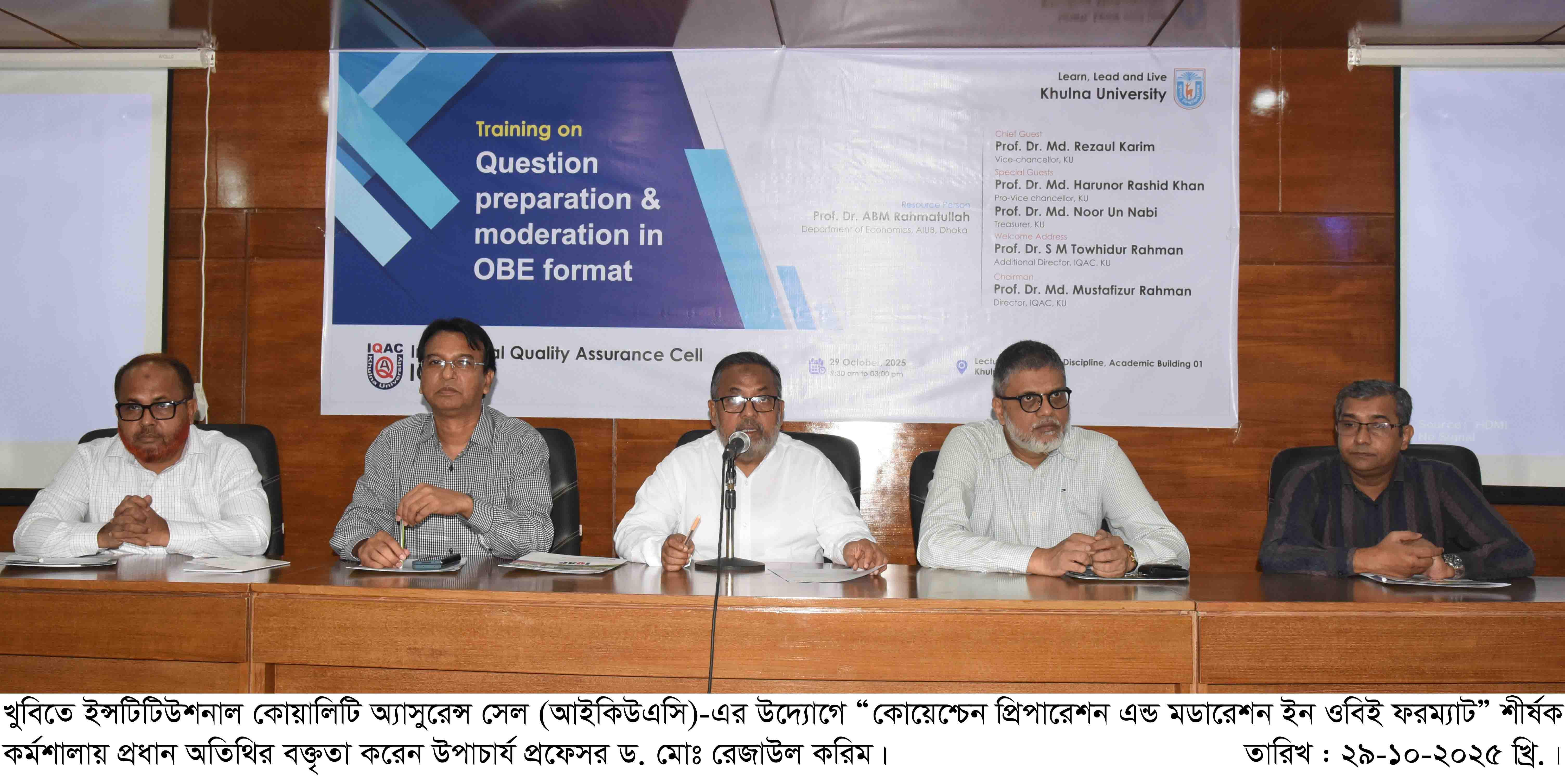 খুলনা বিশ্ববিদ্যালয়ের ইনস্টিটিউশনাল কোয়ালিটি অ্যাসুরেন্স সেল (আইকিউএসি)-এর উদ্যোগে আউটকাম বেজড এডুকেশন (ওবিই) পদ্ধতিতে প্রশ্নপত্র প্রণয়ন ও পরিমার্জন বিষয়ক দিনব্যাপী প্রশিক্ষণ অনুষ্ঠিত হয়েছে। ২৯ অক্টোবর (বুধবার) সকাল ৯টা ৩০ মিনিটে ইউআরপি লেকচার থিয়েটারে এ প্রশিক্ষণের উদ্বোধনী অনুষ্ঠানে প্রধান অতিথি হিসেবে বক্তব্য রাখেন উপাচার্য প্রফেসর ড. মোঃ রেজাউল করিম।