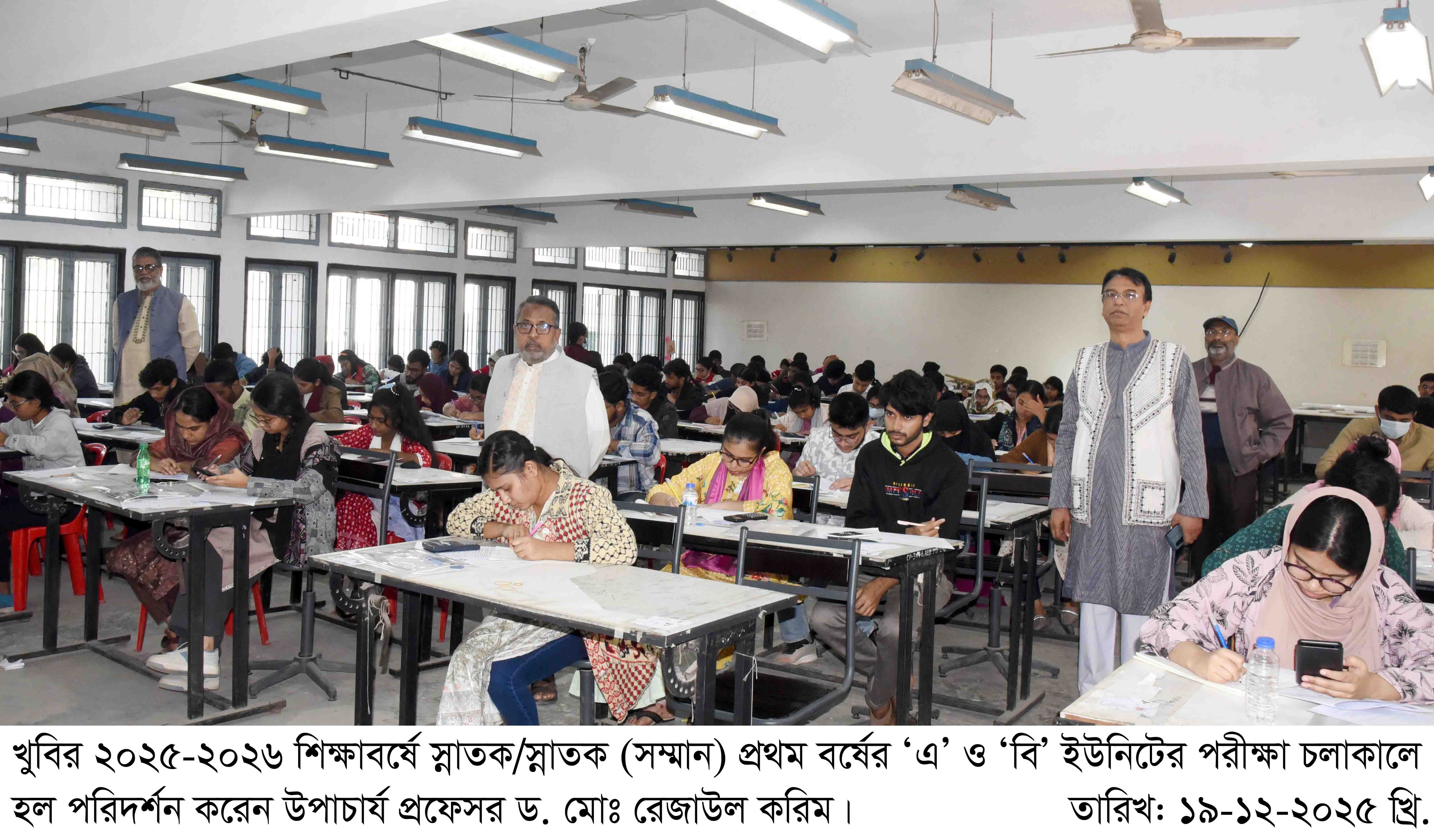 পরীক্ষাকালীন সময়ে খুলনা বিশ্ববিদ্যালয়সহ স্থানীয় কেন্দ্রগুলোর কন্ট্রোল রুম ও পরীক্ষার হল পরিদর্শন করেন বিশ্ববিদ্যালয়ের উপাচার্য প্রফেসর ড. মোঃ রেজাউল করিম। এ সময় আরও উপস্থিত ছিলেন উপ-উপাচার্য প্রফেসর ড. মোঃ হারুনর রশীদ খান, ট্রেজারার প্রফেসর ড. মোঃ নূরুন্নবী, বিজ্ঞান, প্রকৌশল ও প্রযুক্তিবিদ্যা স্কুলের ডিন প্রফেসর ড. মোঃ আশরাফুল আলম, জীববিজ্ঞান স্কুলের ডিন প্রফেসর ড. মোঃ গোলাম হোসেন এবং ছাত্র বিষয়ক পরিচালক প্রফেসর ড. মোঃ নাজমুস সাদাত। তাঁরা সুষ্ঠু ও শান্তিপূর্ণ পরিবেশে পরীক্ষা অনুষ্ঠিত হওয়ায় সন্তোষ প্রকাশ করেন। এ সময় দায়িত্বরত ইউনিট প্রধানসহ সংশ্লিষ্ট শিক্ষকবৃন্দও উপস্থিত ছিলেন।