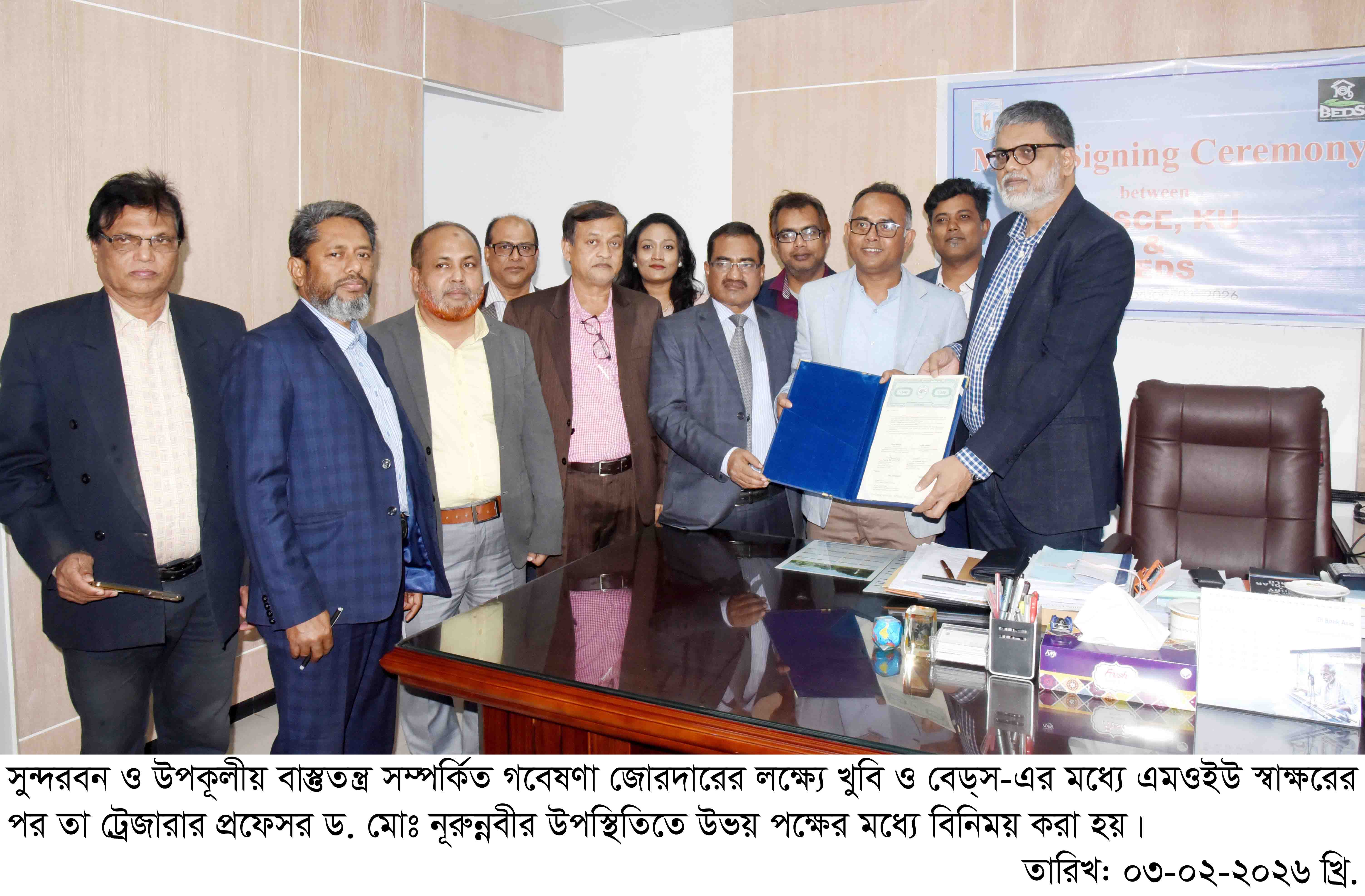 সুন্দরবন ও উপকূলীয় ইকোলজি সম্পর্কিত গবেষণা জোরদারের লক্ষ্যে খুলনা বিশ্ববিদ্যালয়ের ইনস্টিটিউট ফর ইন্টিগ্রেটেড স্টাডিজ অন দ্য সুন্দরবনস এন্ড কোস্টাল ইকোসিস্টেম (আইআইএসএসসিই) ও বাংলাদেশ এনভায়রনমেন্ট এন্ড ডেভেলপমেন্ট সোসাইটি (বেড্স) এর মধ্যে সমঝোতা স্মারক (এমওইউ) স্বাক্ষরিত হয়েছে।