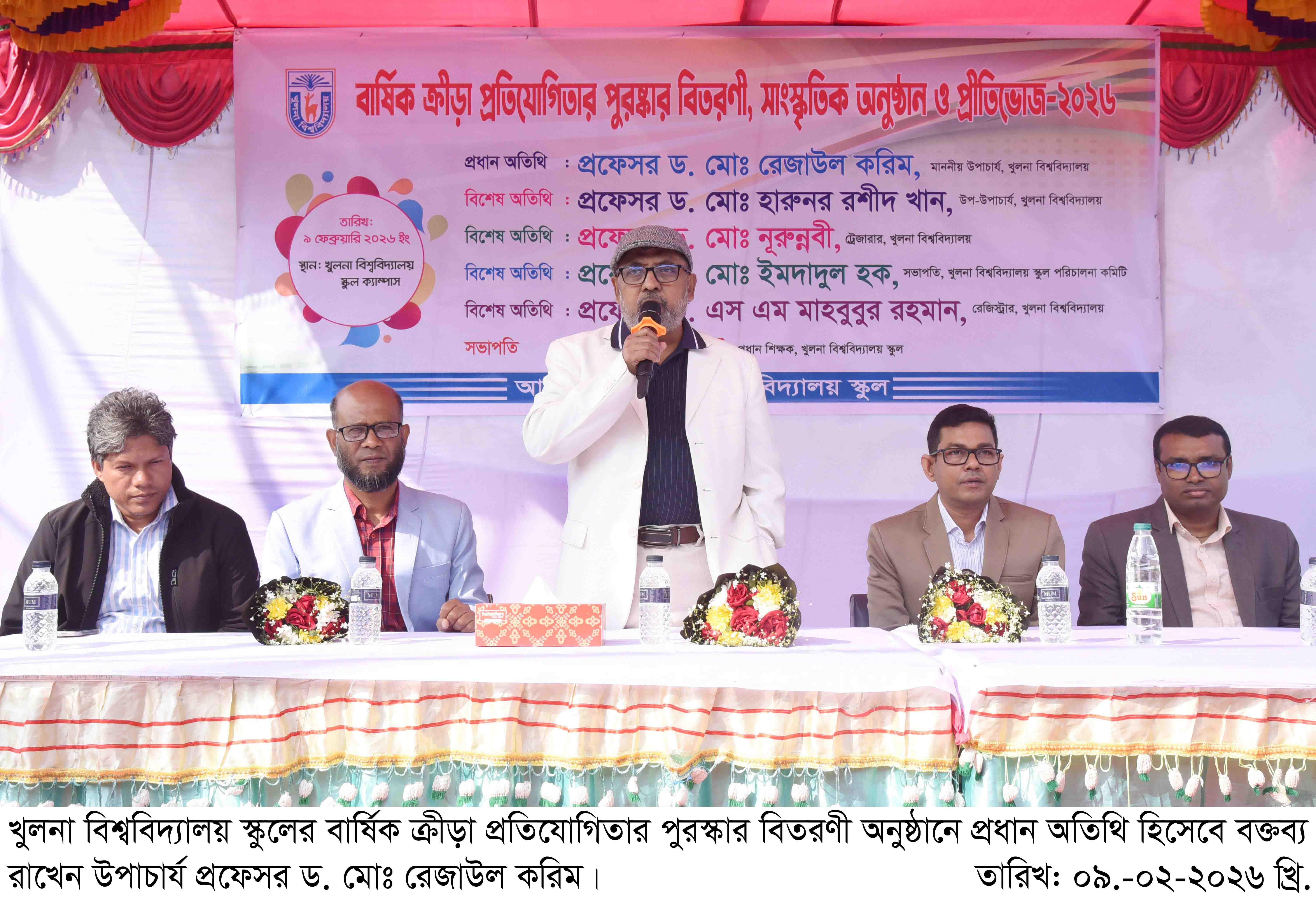 খুলনা বিশ্ববিদ্যালয় স্কুলের বার্ষিক ক্রীড়া প্রতিযোগিতার পুরস্কার বিতরণী ও সাংস্কৃতিক অনুষ্ঠান ০৯ ফেব্রুয়ারি (সোমবার) স্কুল প্রাঙ্গণে অনুষ্ঠিত হয়েছে। সকাল সাড়ে ৯টায় প্রধান অতিথি হিসেবে ফিতা কেটে অনুষ্ঠানের উদ্বোধন করেন বিশ্ববিদ্যালয়ের উপাচার্য প্রফেসর ড. মোঃ রেজাউল করিম। এসময় তিনি শিক্ষার্থীদের সালাম গ্রহণ করেন।