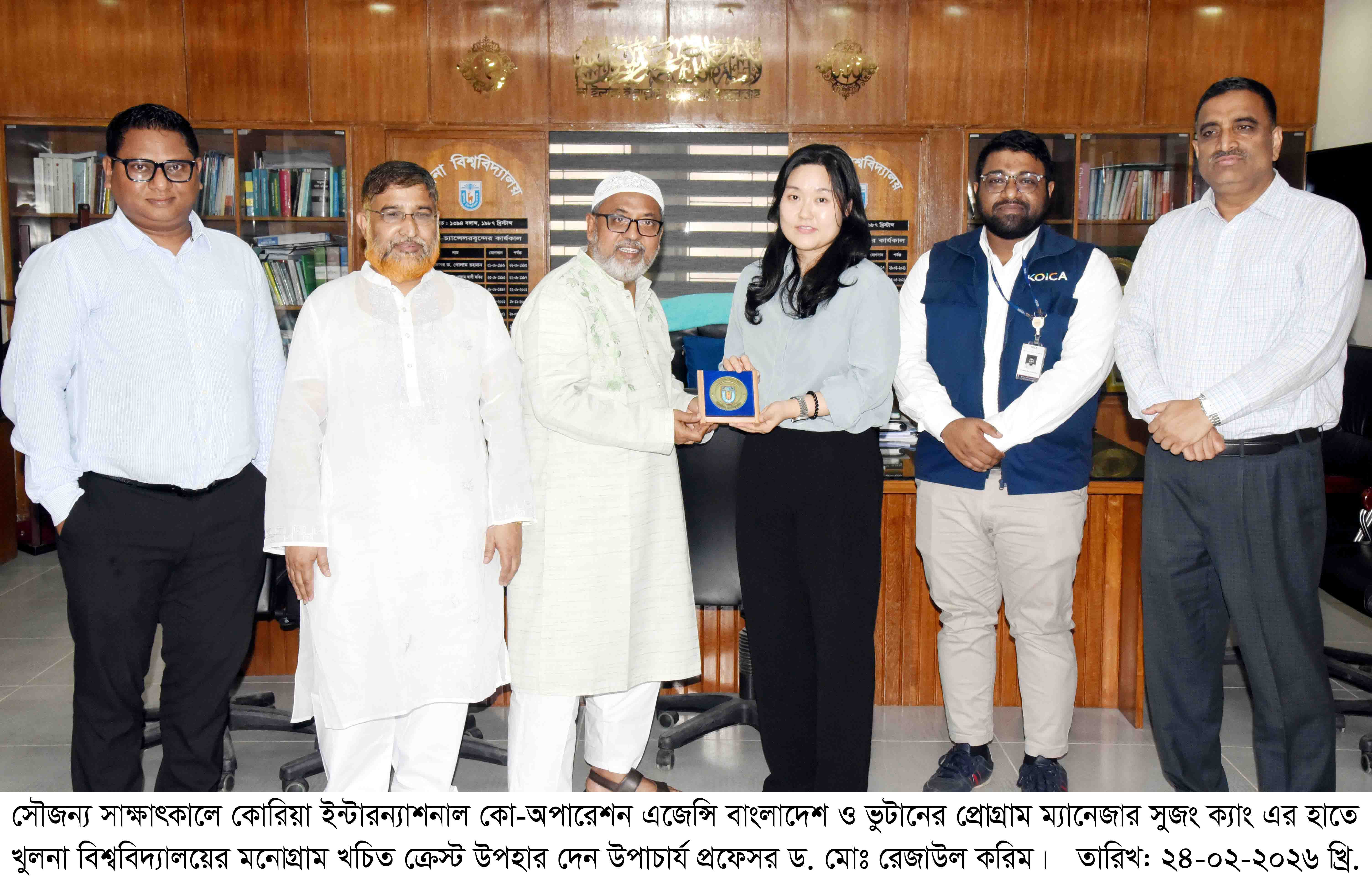 পরবর্তীতে তাঁরা উপাচার্য প্রফেসর ড. মোঃ রেজাউল করিম এর সঙ্গে সৌজন্য সাক্ষাৎ করেন। সাক্ষাৎকালে কোরিয়ান ভাষা শিক্ষা প্রোগ্রামে কোরিয়ান ভলান্টিয়ার শিক্ষক প্রেরণের বিষয়ে খুলনা বিশ্ববিদ্যালয়ের আগ্রহের কথা তুলে ধরা হয়। উপাচার্য এ ক্ষেত্রে প্রয়োজনীয় সব ধরনের সহযোগিতার আশ্বাস প্রদান করেন।